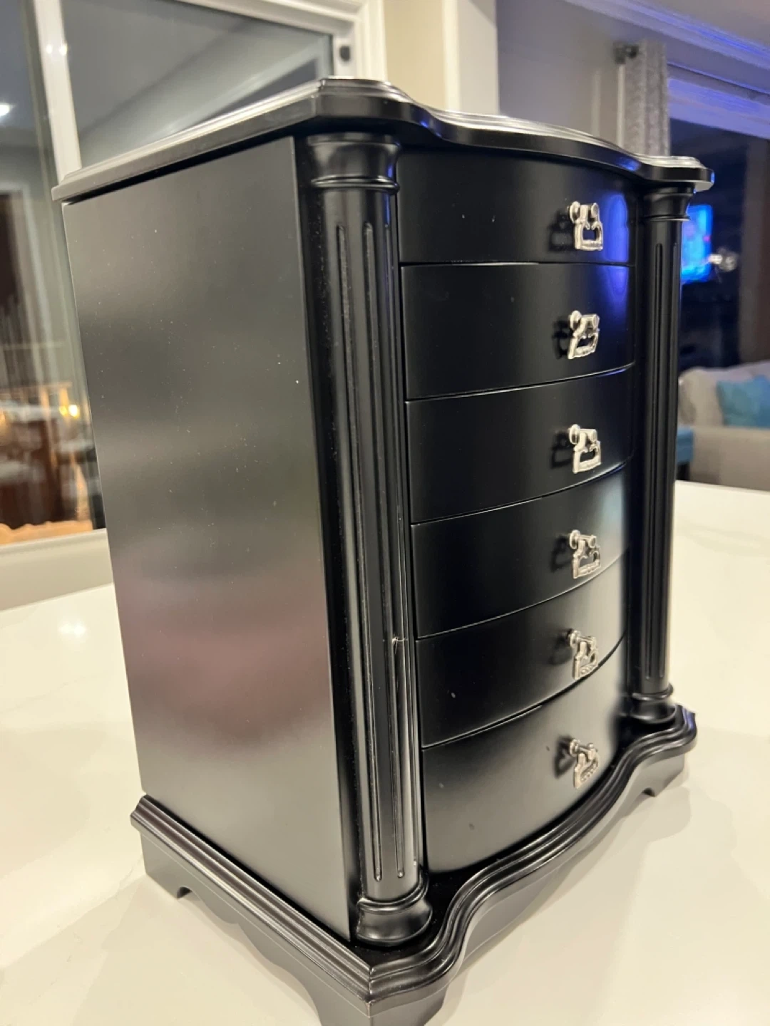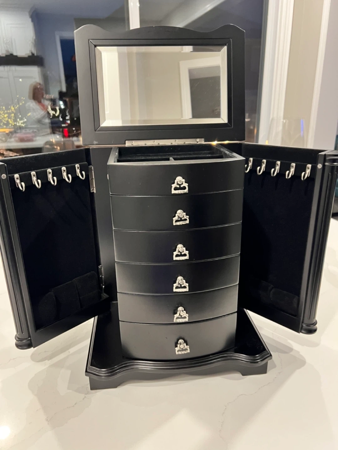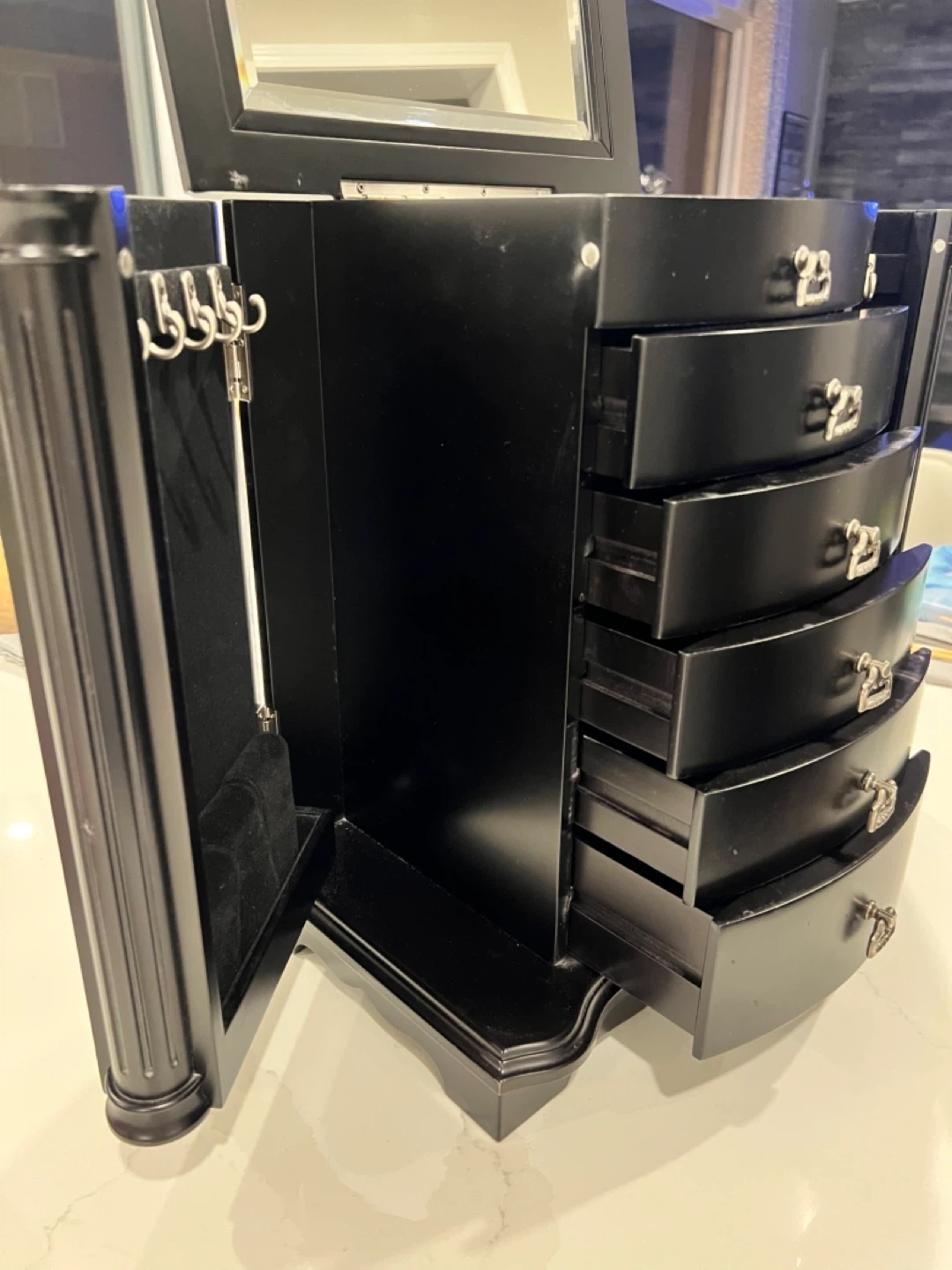 Spots for rings, earrings, many drawers and hooks on the doors for chains.
