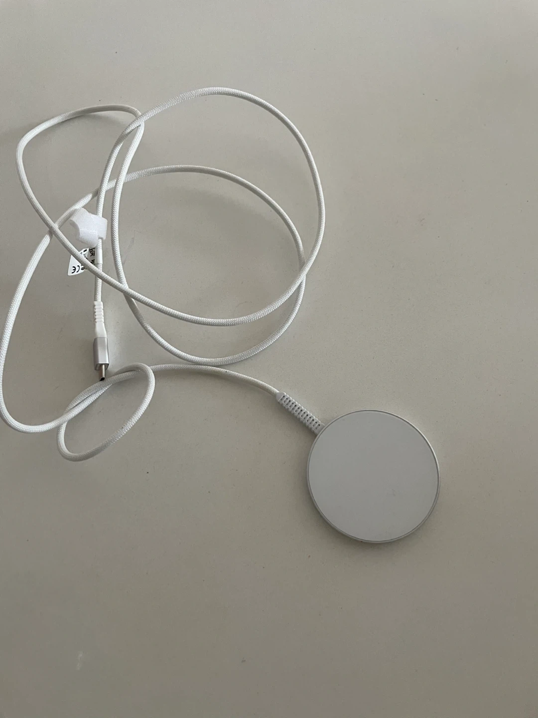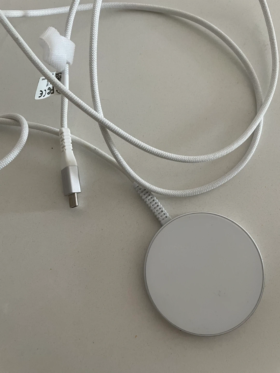 This is a white magnetic wireless charger with a braided cable. It has a USB-C connector. Charges devices wirelessly when magnetically attached.