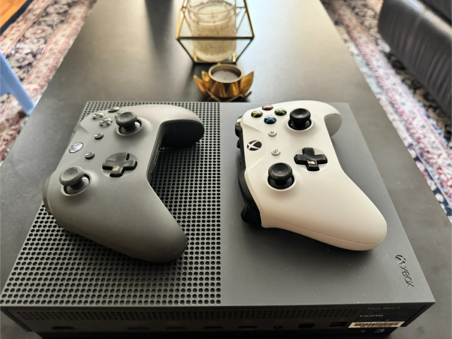 Includes an Xbox One S console, a grey controller, and a white controller. Perfect for playing multiplayer games with friends or family. All items are in good condition and ready for gaming!