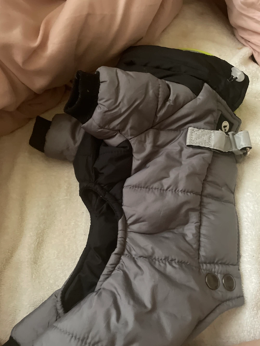 This gray and black puffer dog coat is a size S. It features a soft lining and secure snap closures for a comfortable fit. It's perfect for keeping your small dog warm during colder weather! Their is a little of rust on the metal part around the dogs butt.