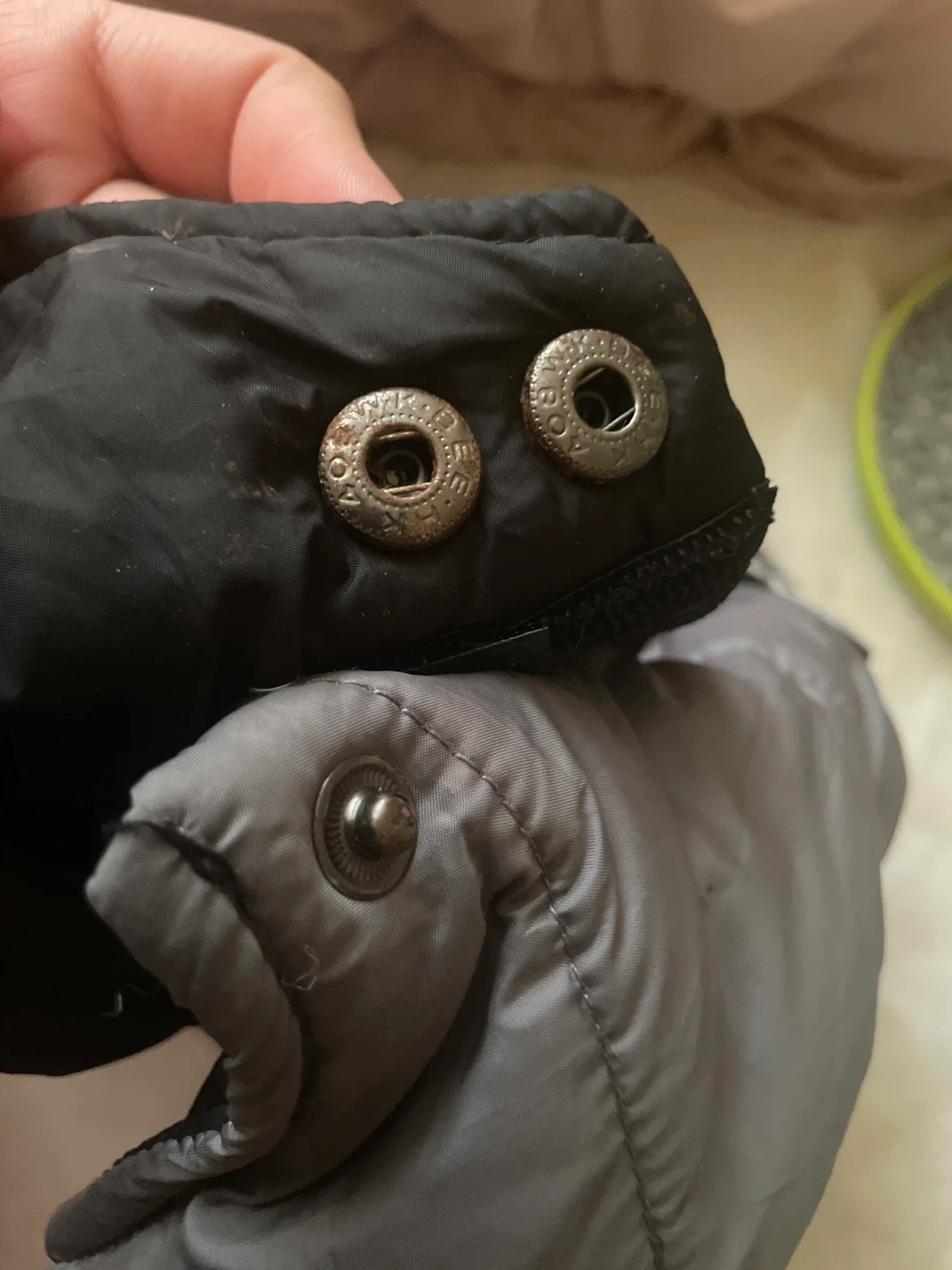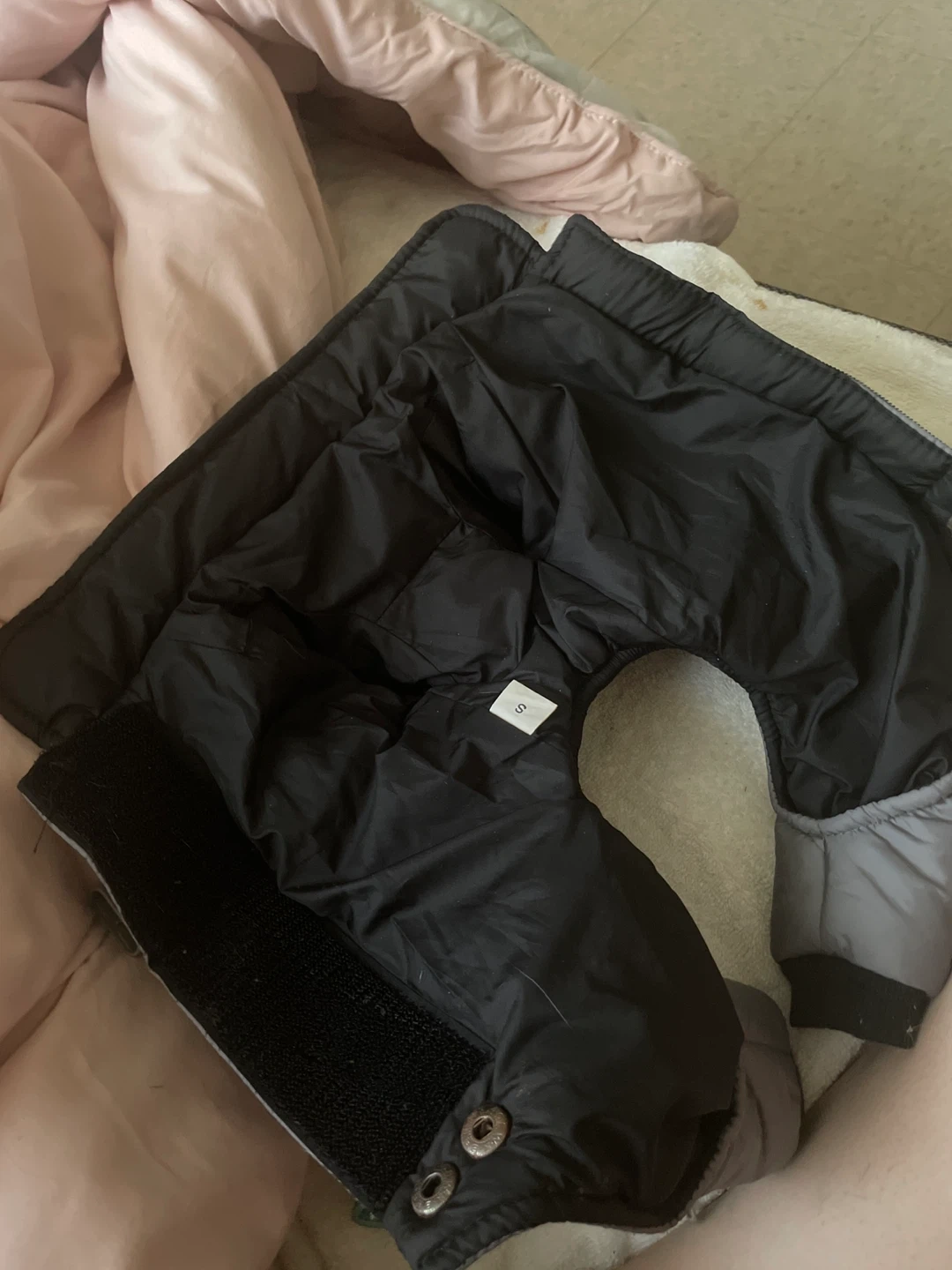 This gray and black puffer dog coat is a size S. It features a soft lining and secure snap closures for a comfortable fit. It's perfect for keeping your small dog warm during colder weather! Their is a little of rust on the metal part around the dogs butt.