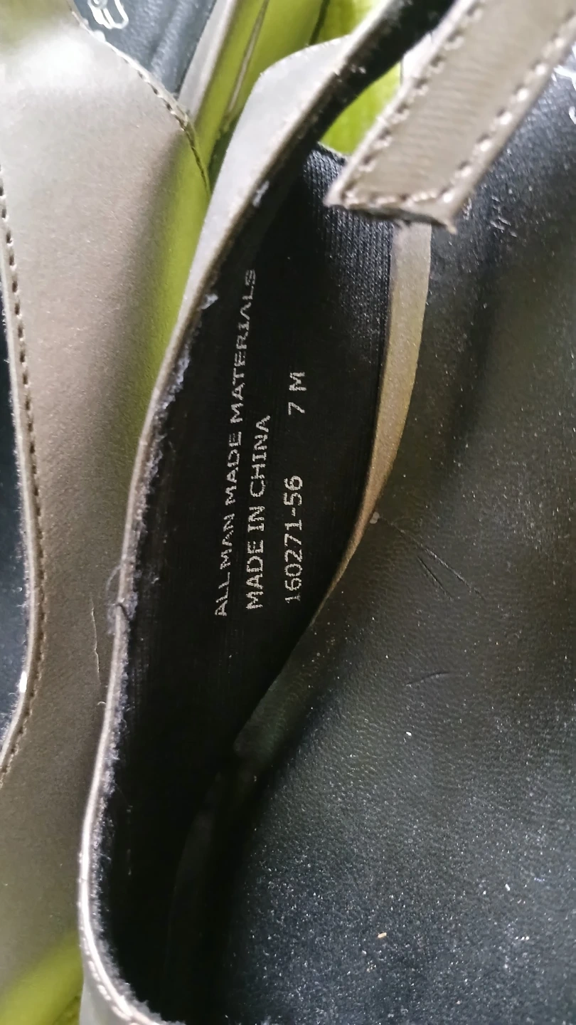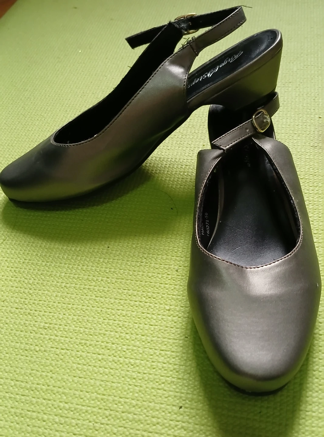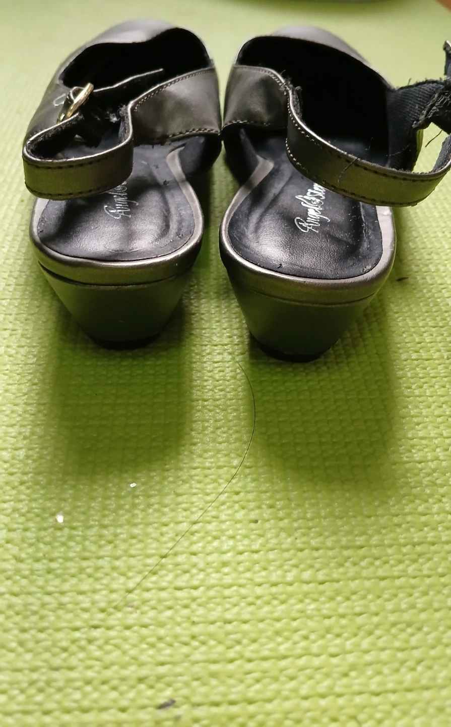 These slingback heels are a stylish metallic pewter color, and feature an adjustable ankle strap. Size 7M.