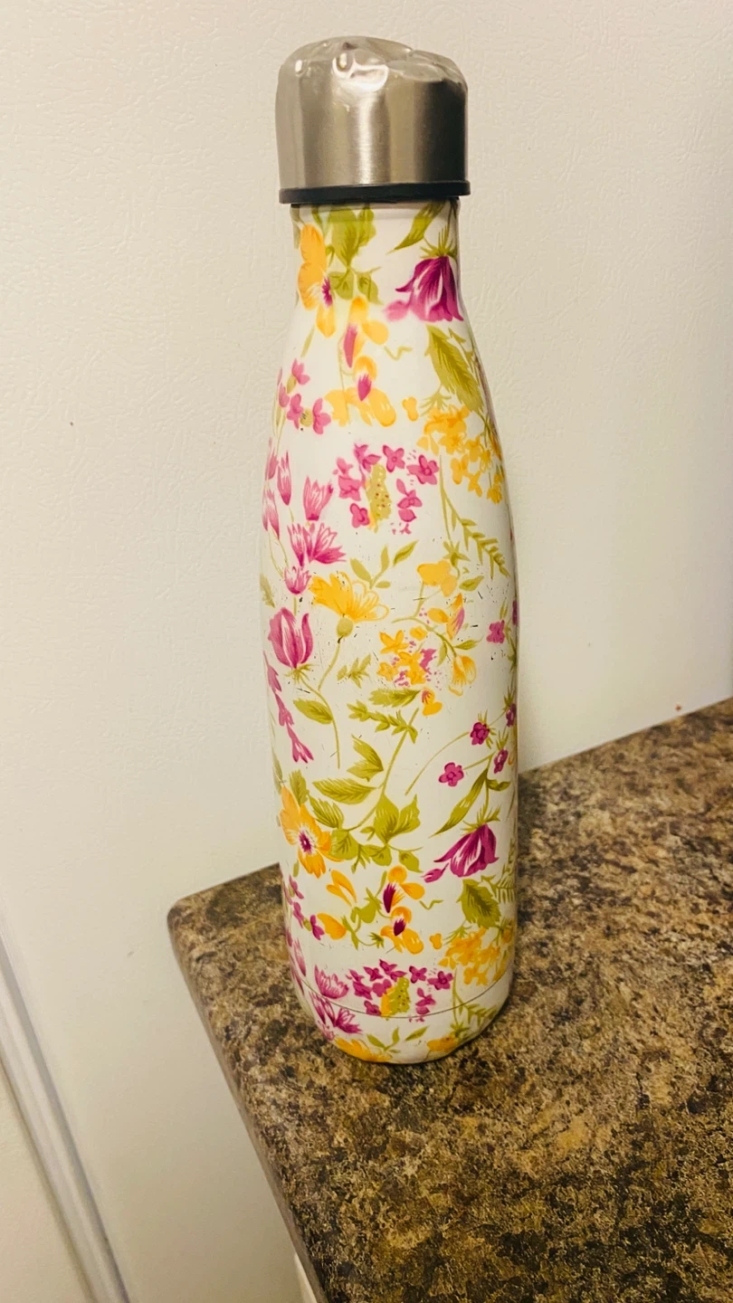 FREE :- This is a reusable water bottle with a vibrant floral design. It's made of durable material and features a secure screw-on lid. Great for staying hydrated on the go, fair condition.