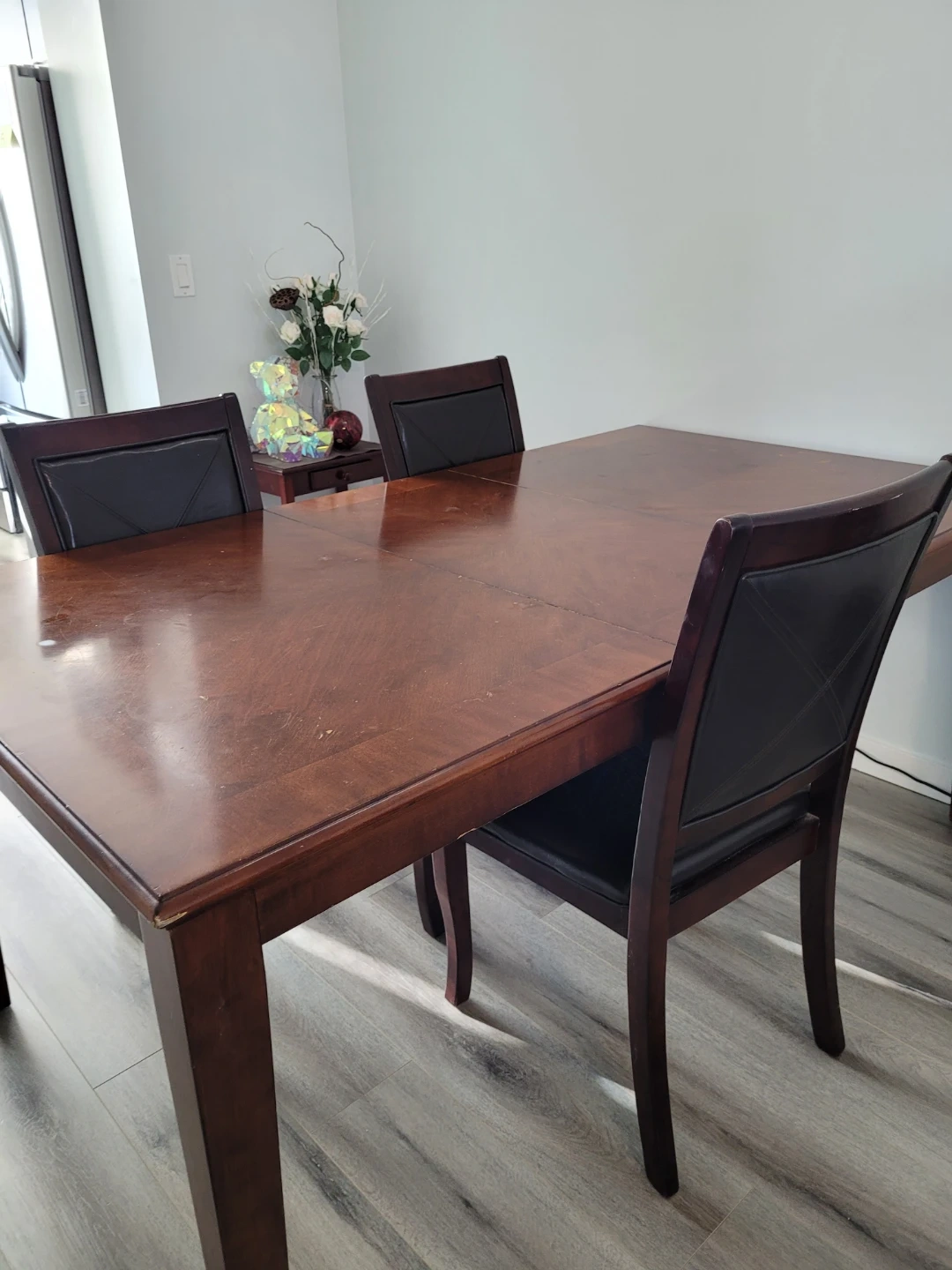 This is a lovely wooden dining table with 3 matching chairs. 1 chair is broken. The table has some scratches. But it is not big issue at all.It's a great set for family dinners or entertaining guests! It can 4 person table or 6 person table.
