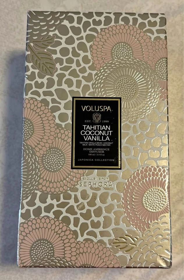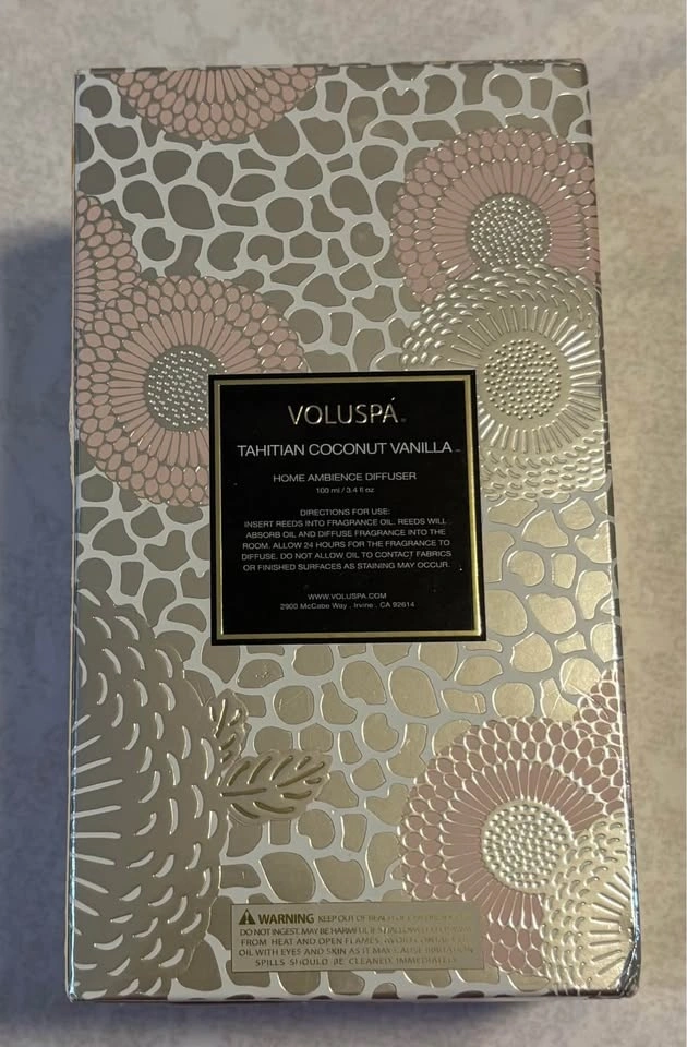 Brand new in box and no longer available in stores. Tahitian Coconut Vanilla is a warm scent with soft tropical notes. Includes diffuser bottle and reeds.