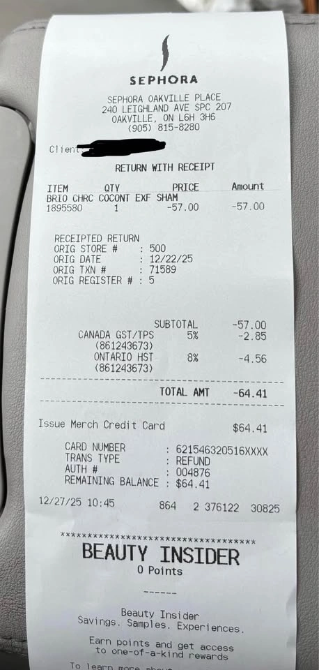 Sephora store merchandise credit with a confirmed balance of $64.41. Issued from a return and redeemable in store at Sephora. Card is not linked to an account and can be used by the holder. Receipt shown to confirm balance. Balance: $64.41. Use: In-store Sephora purchases.
