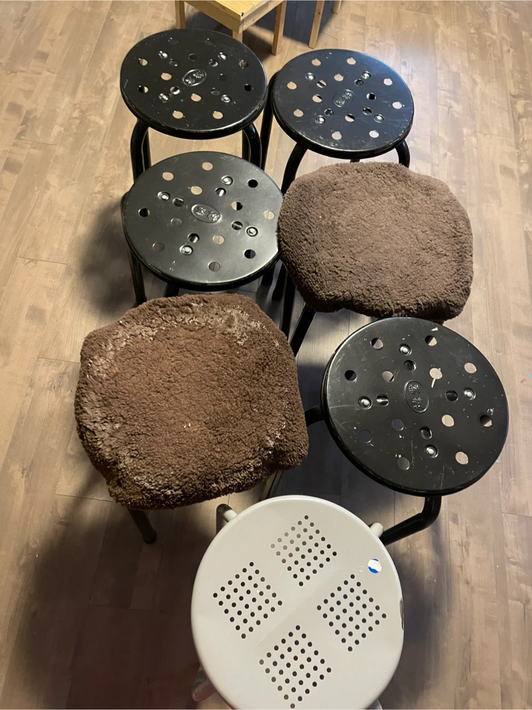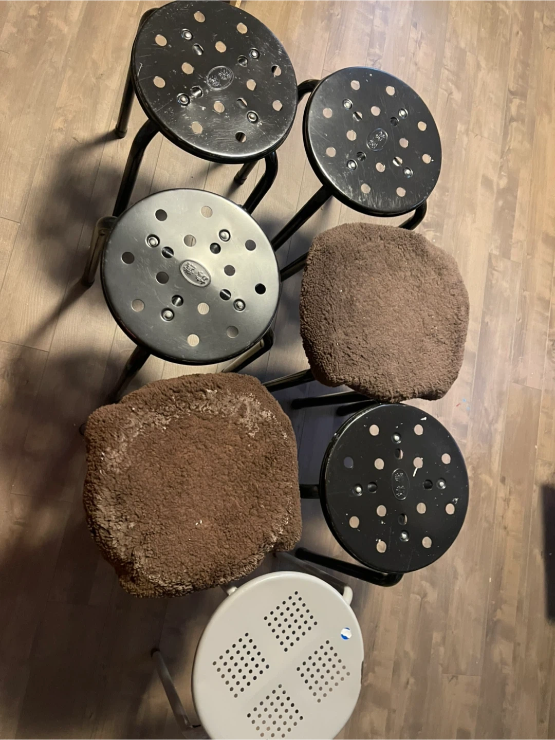 This set includes 7 metal stools. Four are black and one is light grey. They're sturdy and stackable for easy storage. Great for extra seating in a kitchen or workshop!