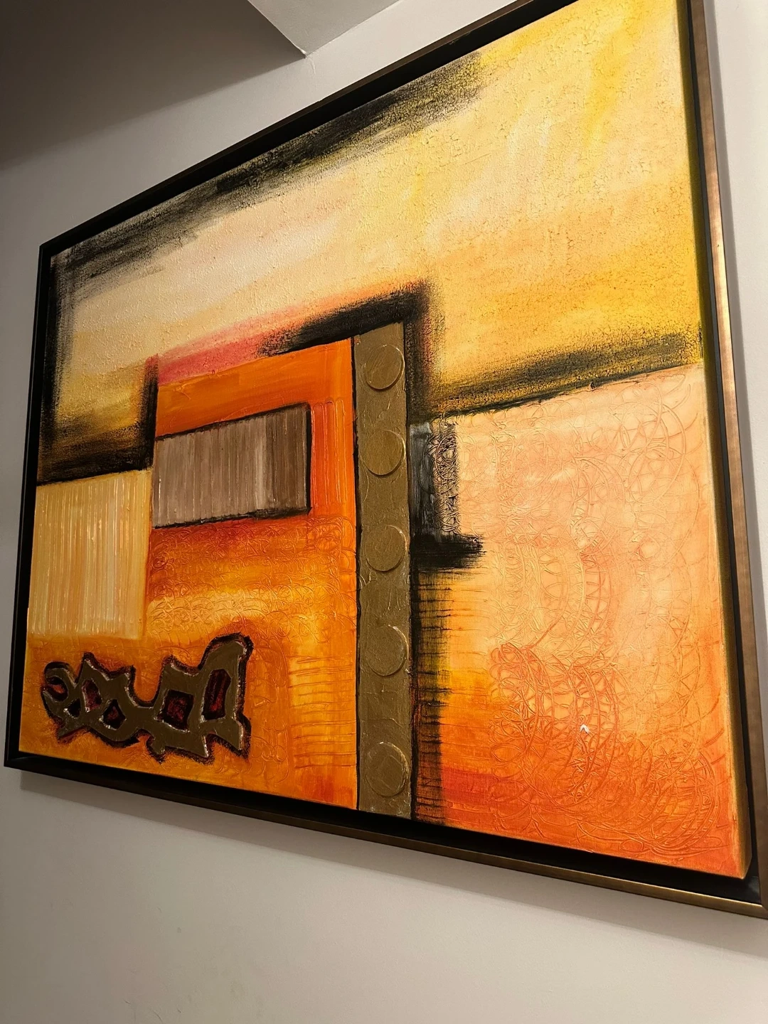 Textured abstract painting featuring bold orange and yellow hues with metallic gold accents. This piece offers a unique tactile finish and a modern aesthetic. Framed and ready to hang, it's a statement piece for any room.