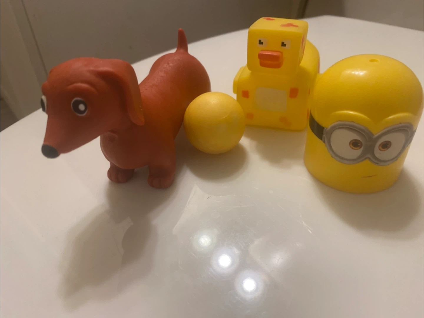 Free :- This lot includes a red rubber dachshund dog toy, a yellow Minecraft-style duck toy, and a yellow Minion toy. They're all made of durable rubber or plastic for playtime. Assorted toys.