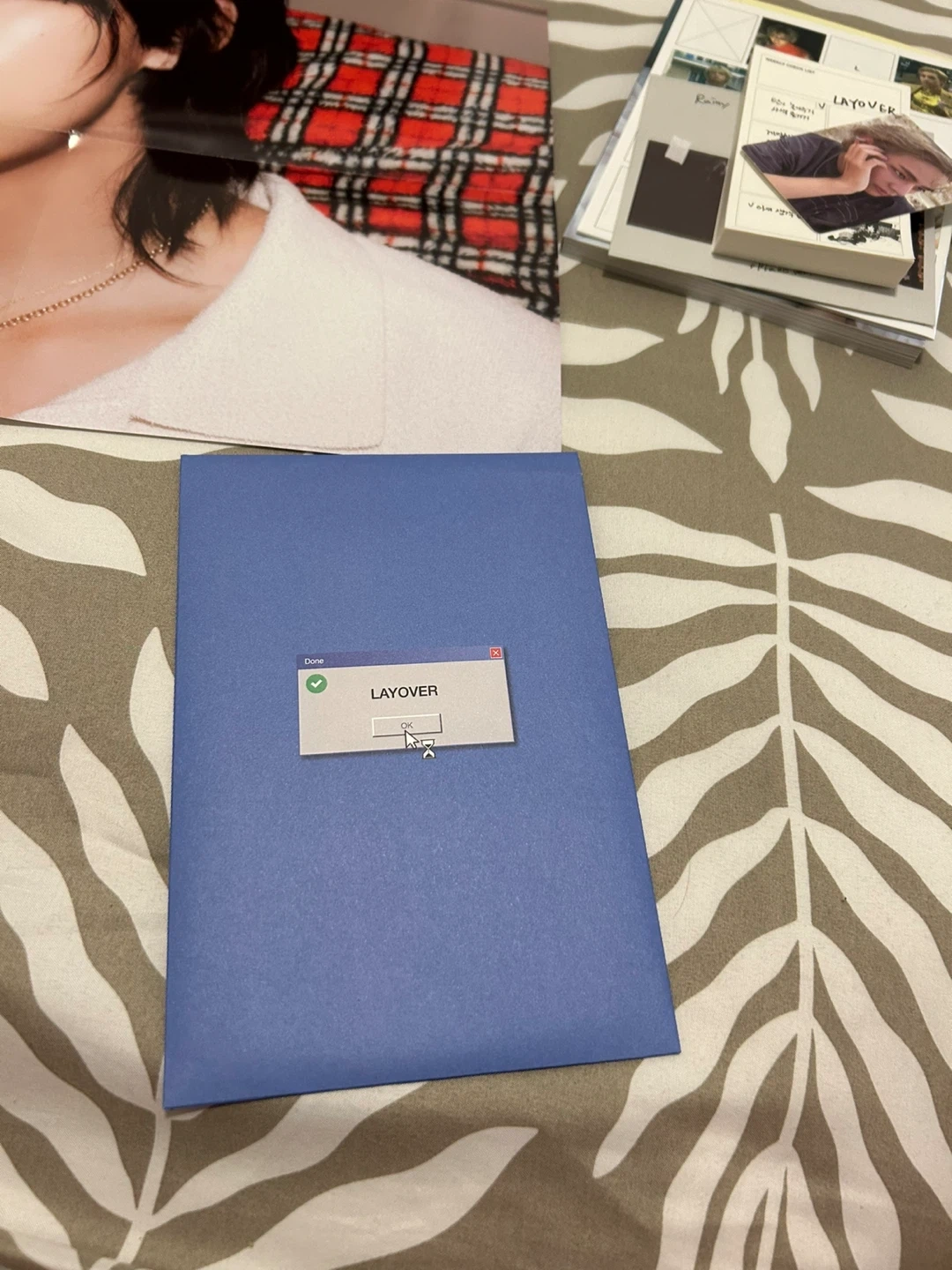 This is the BTS V Layover album box set, including the album, photobook, and various photo cards and stickers. It's a complete package for fans. Includes original packaging and all contents.