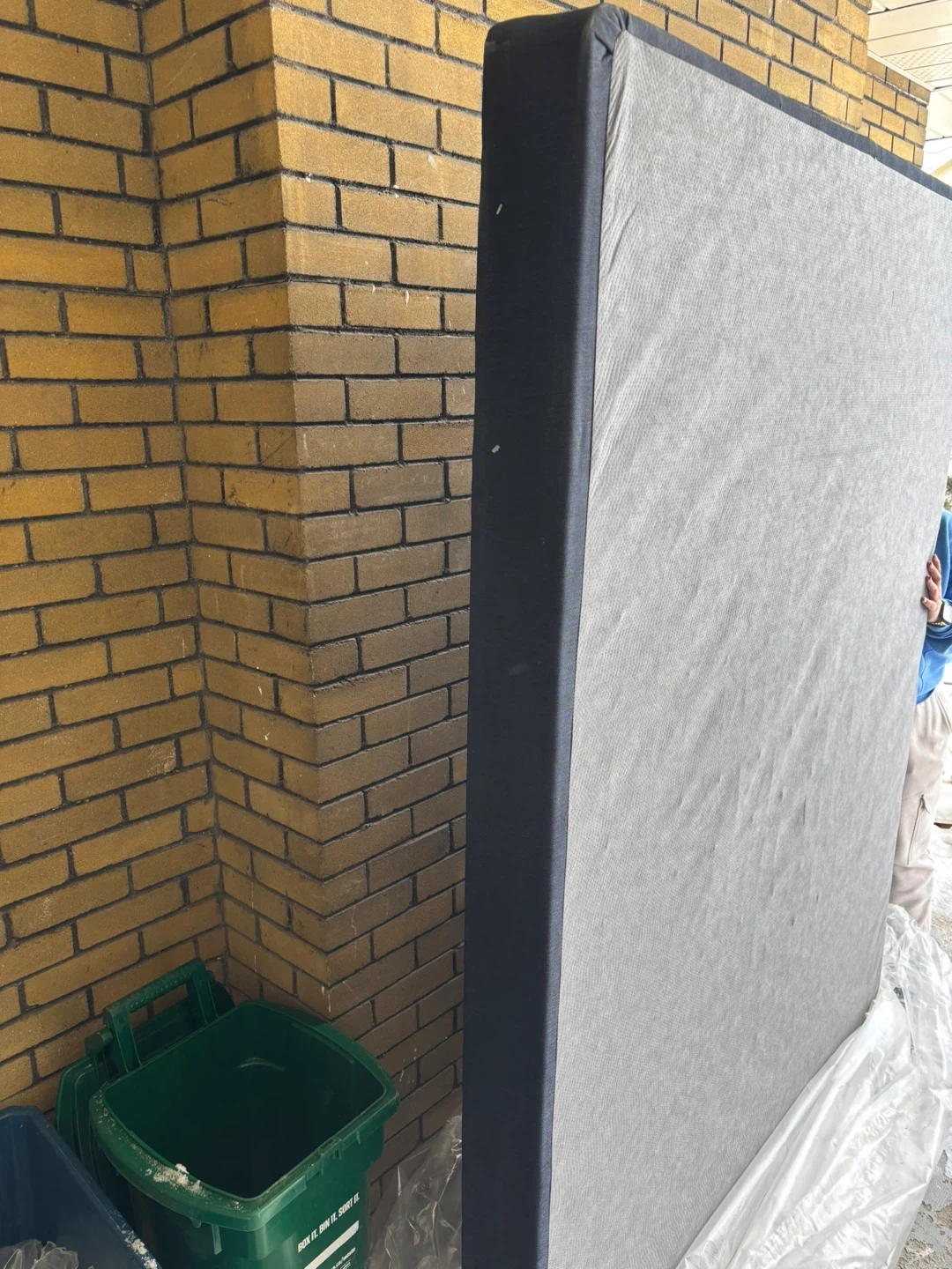 Queen size box spring in a grey fabric. It has a dark blue trim around the edges. This box spring is in good condition and provides a solid foundation for your mattress. Askin 120 OBO. Need it gone ASAP