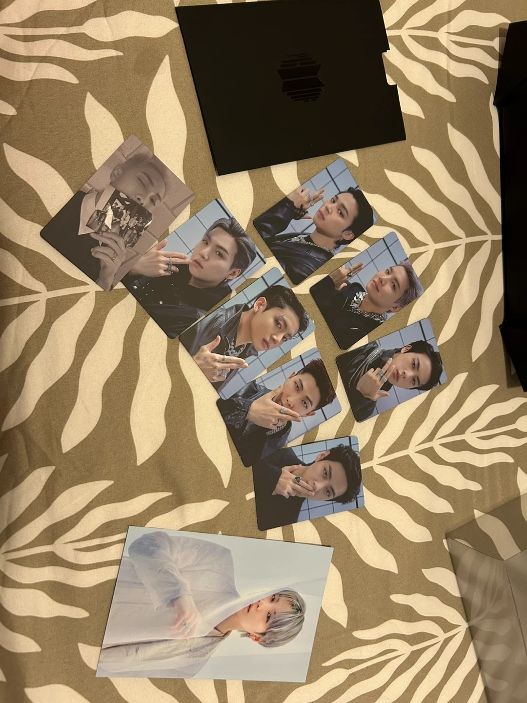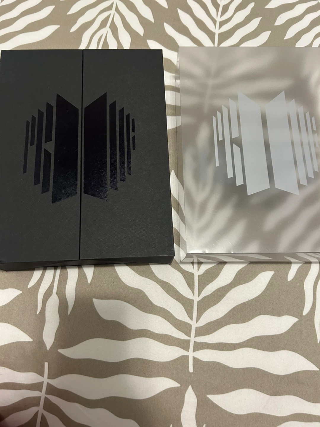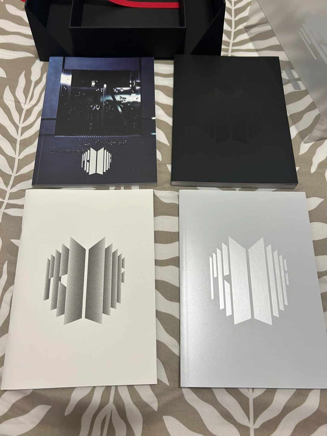 This is the BTS Proof album set. It includes three CDs, several photo cards, photo books and poster. The packaging is a dark grey box with the album title 'Proof' on the inside lid.