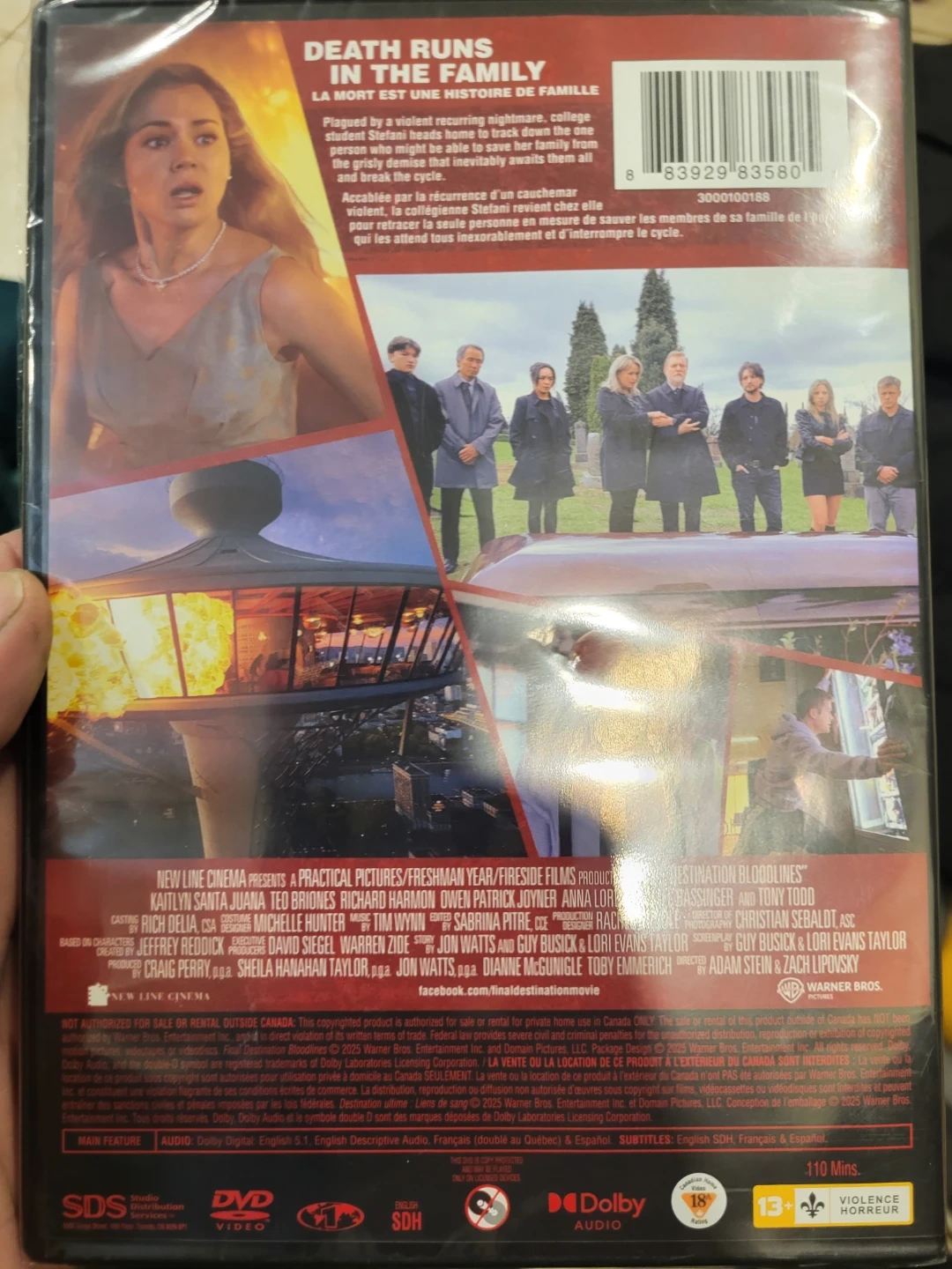 This DVD contains the movie Final Destination Bloodlines. It features a runtime of 110 minutes and includes English Dolby Digital audio and subtitles. Rated 18+ for violence.