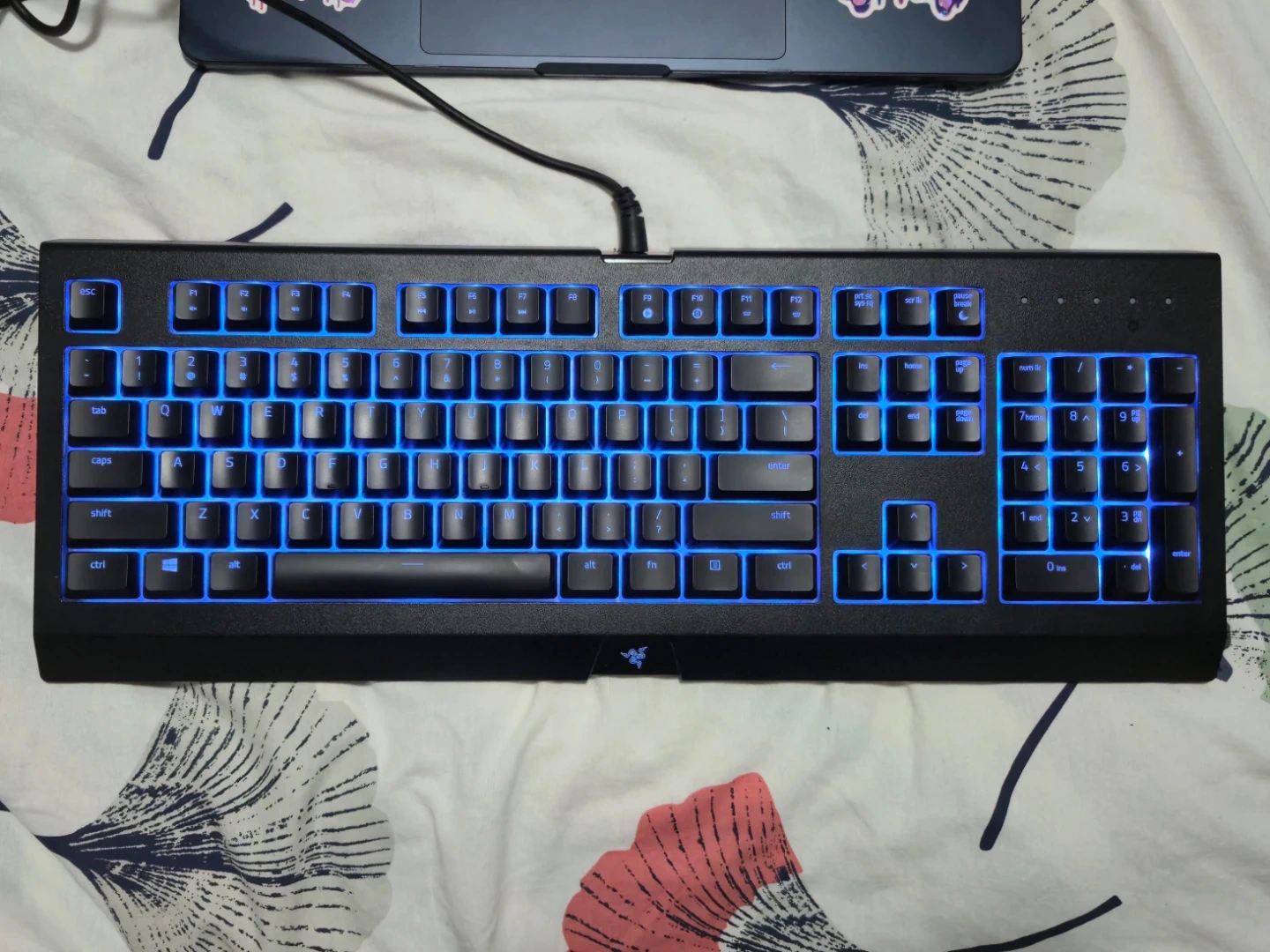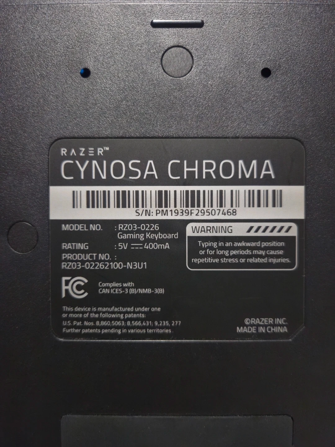 This is a Razer Cynosa Chroma gaming keyboard. It's a membrane keyboard with customizable RGB lighting. Typing in an awkward position or for long periods may cause repetitive stress or related injuries.