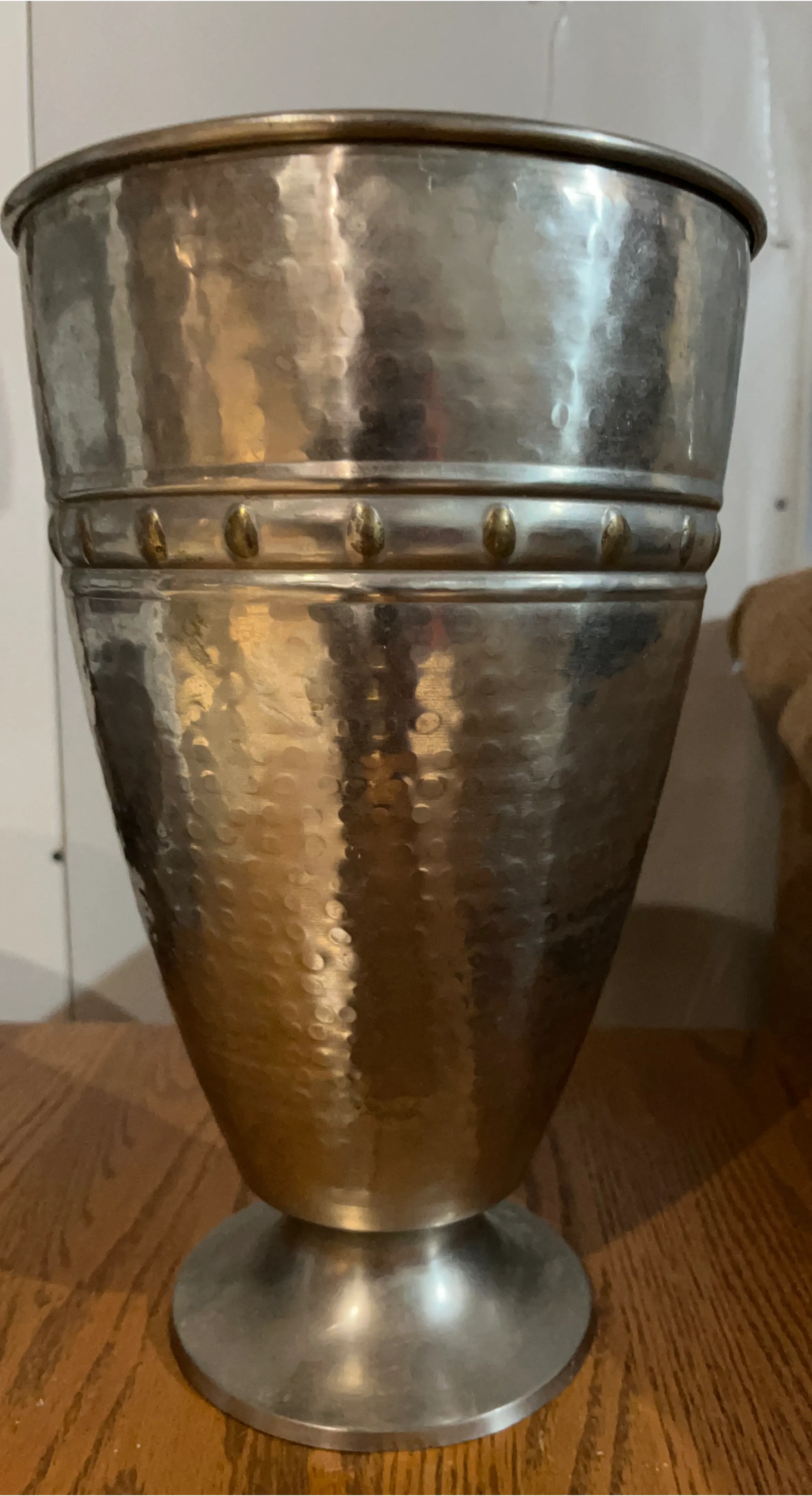 A decorative hammered metal urn vase. It has a metallic finish with brass-coloured studs around the middle band. It stands on a decorative base.
