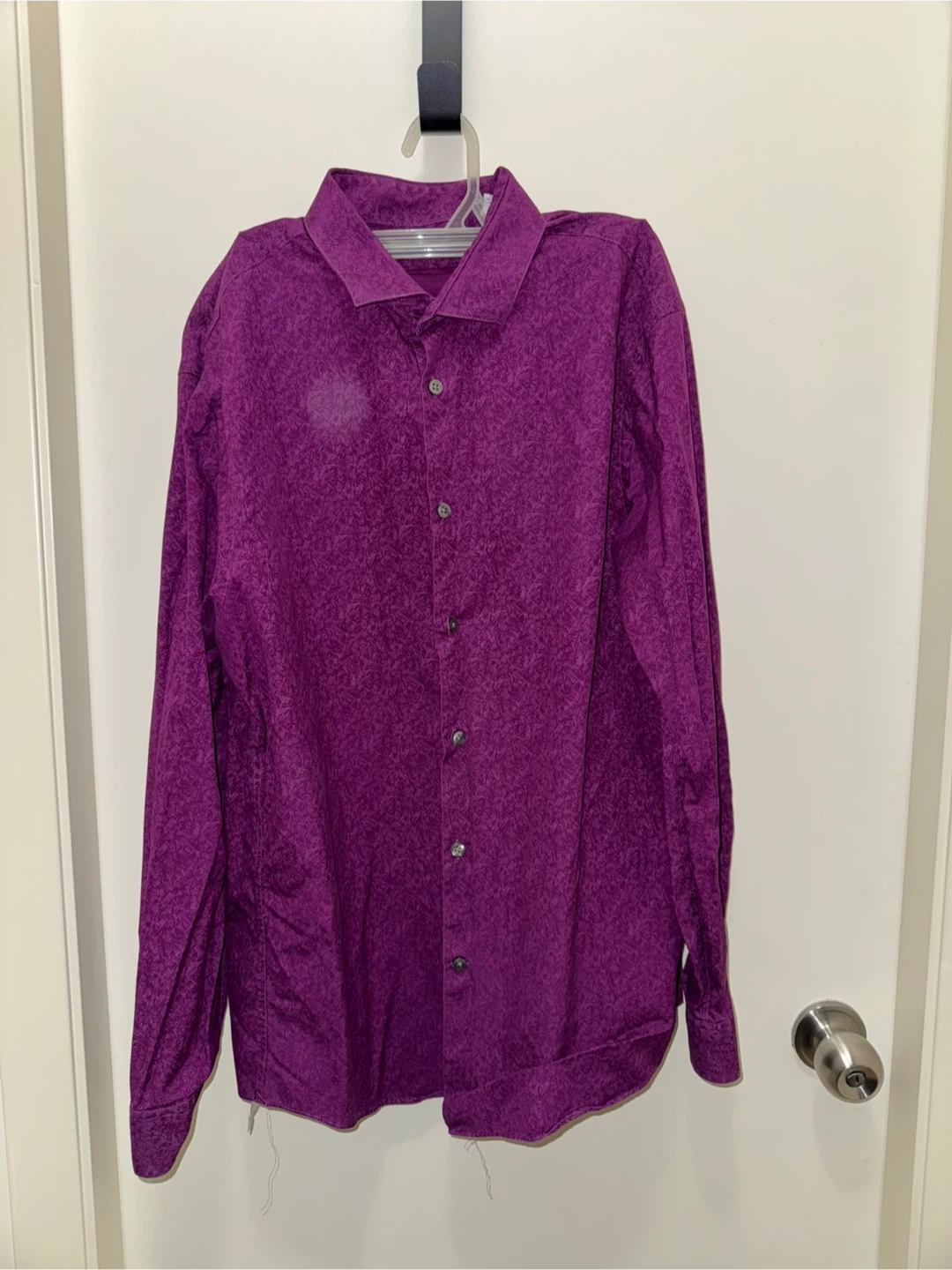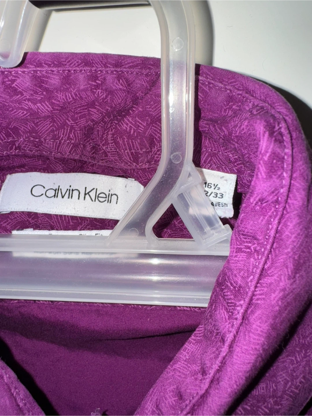 Men's Calvin Klein dress shirt with a purple print. It's a size 16 1/2 neck and 32/33 sleeve length. This button-up shirt features a classic collar and long sleeves. A great shirt for formal or business casual wear!