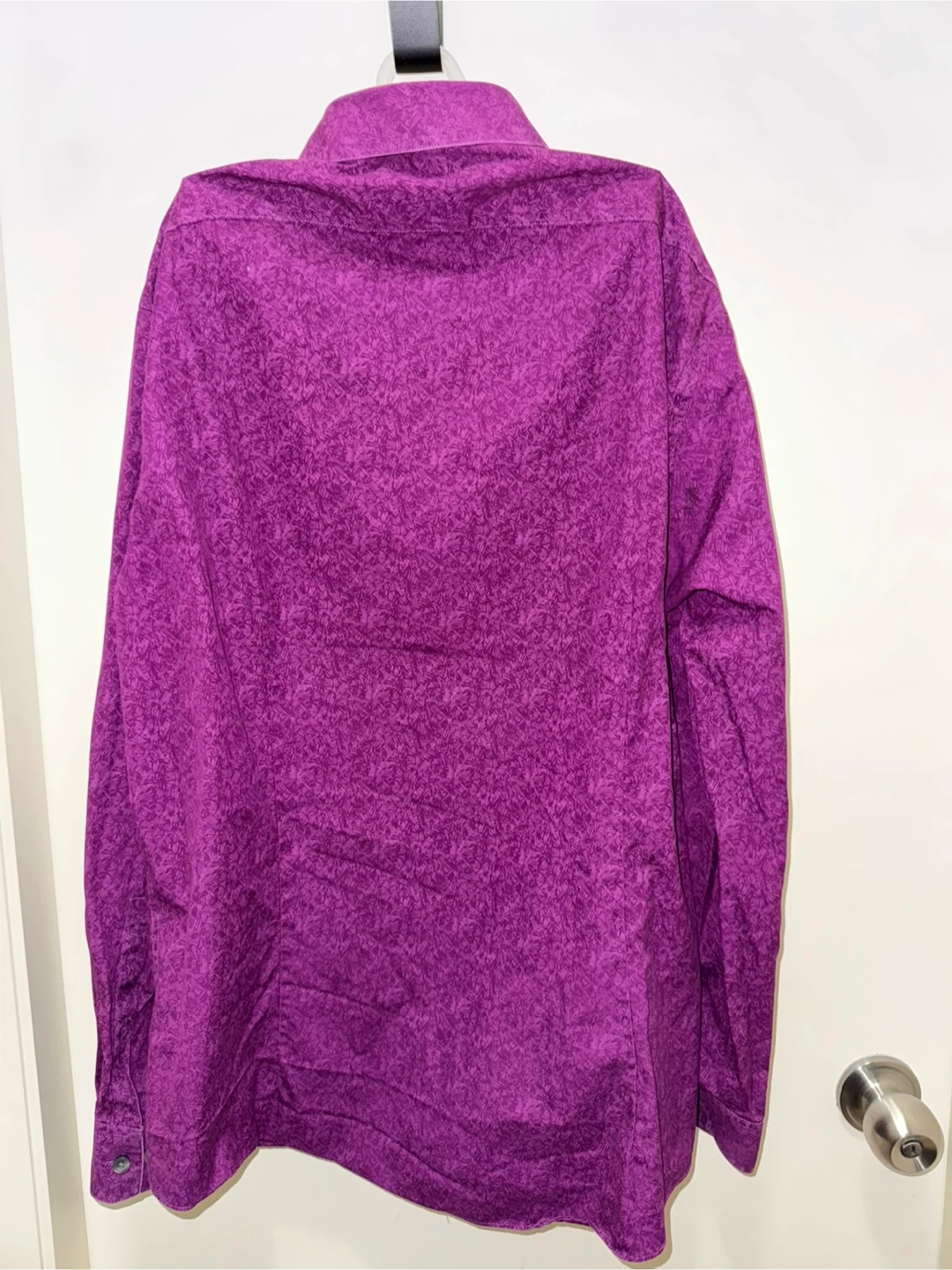 Men's Calvin Klein dress shirt with a purple print. It's a size 16 1/2 neck and 32/33 sleeve length. This button-up shirt features a classic collar and long sleeves. A great shirt for formal or business casual wear!