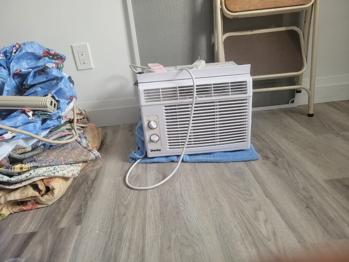 Danby window air conditioner. White colour. Includes power cord and controls for temperature adjustment. This unit is suitable for cooling small to medium-sized rooms.