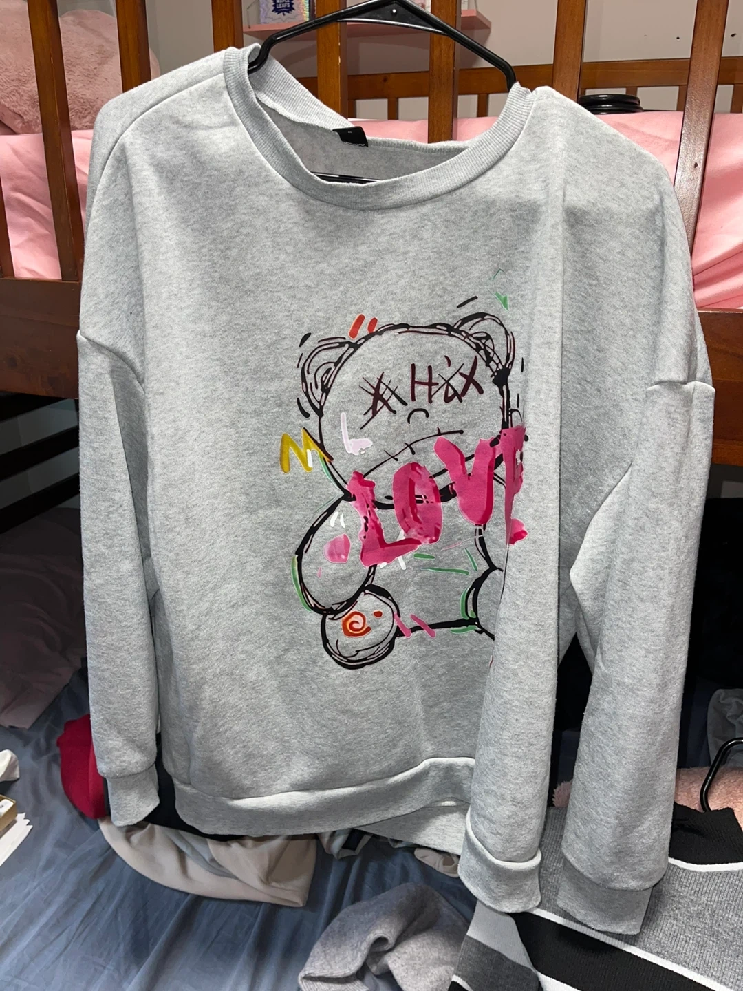 Comfy grey crewneck sweatshirt with a fun bear graphic and 'LOVE' text. It's made from a soft cotton blend. This sweater's a great choice for casual everyday wear.