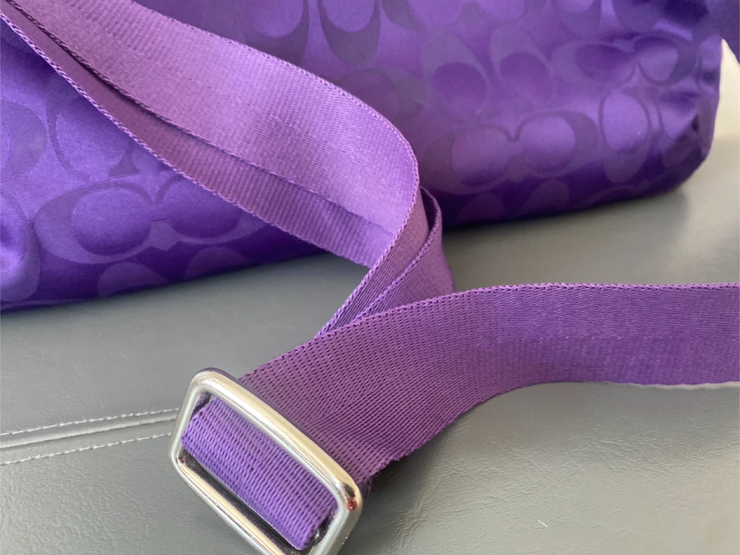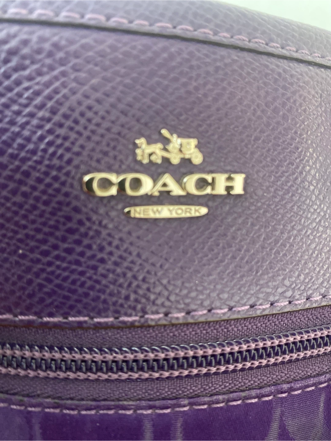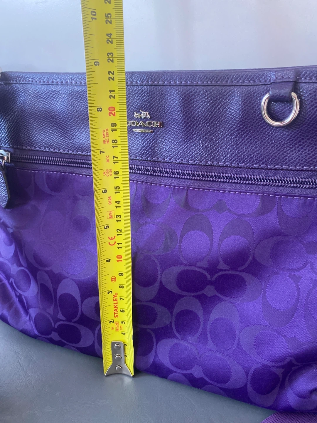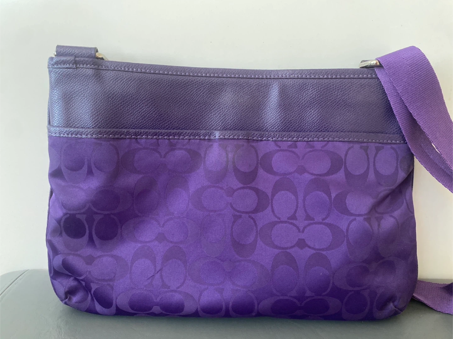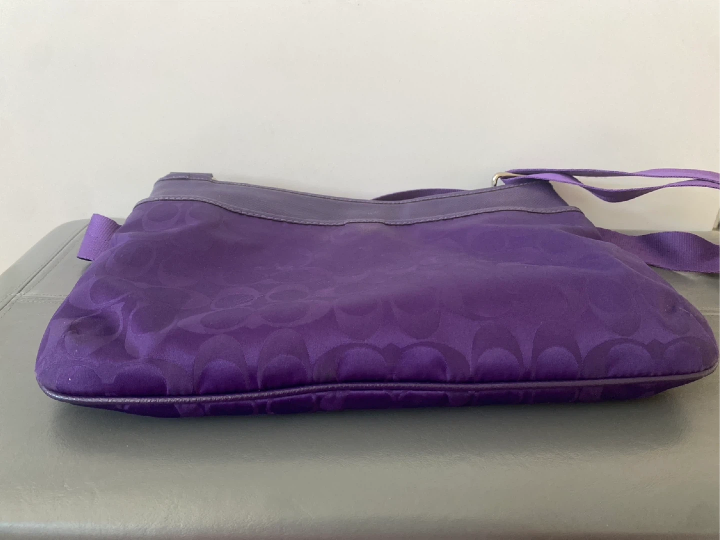 Coach crossbody bag in a vibrant purple with signature C jacquard pattern. It has a leather top panel and adjustable strap. Includes an exterior zippered pocket and interior compartments.
