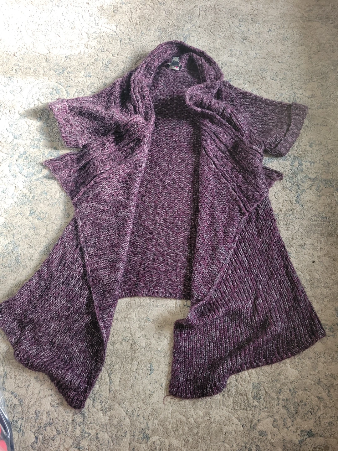 This FYLO cardigan sweater is made from 100% acrylic. It's a size S/P with a heathered purple colour. It features an open-front, draped silhouette and a cozy knit.