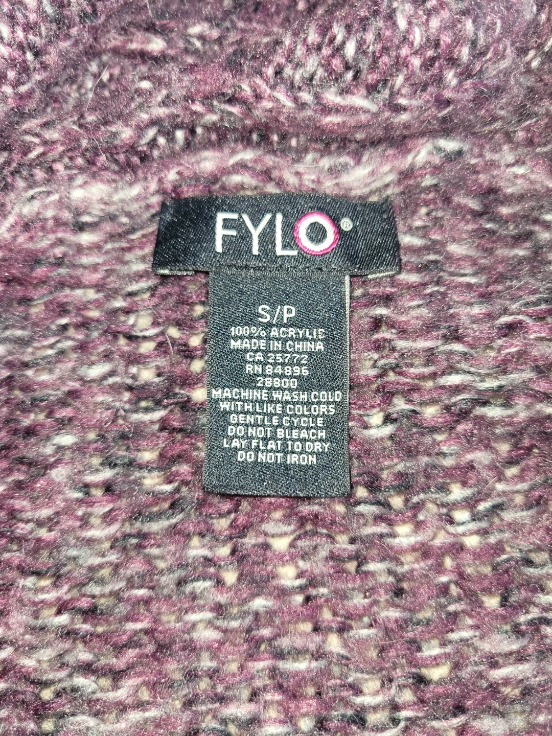 This FYLO cardigan sweater is made from 100% acrylic. It's a size S/P with a heathered purple colour. It features an open-front, draped silhouette and a cozy knit.