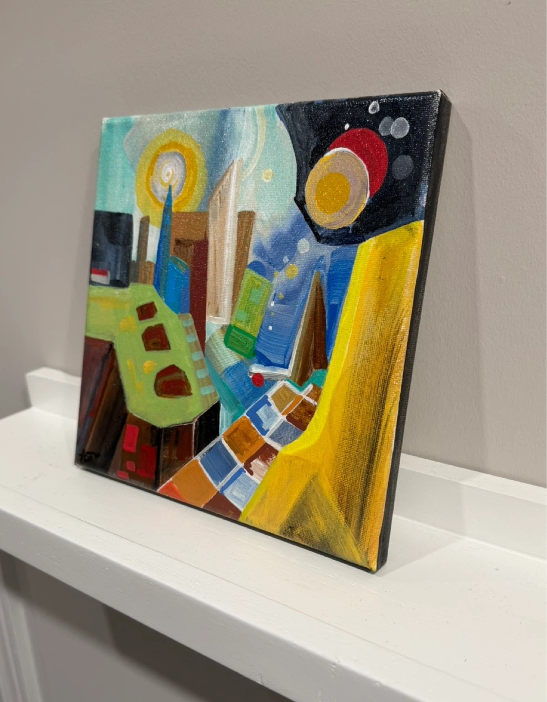 A colourful abstract cityscape acrylic painting on 8”X8”. This hand-painted unique piece would add a pop of colour to any room! Varnished with glossy topcoat making the colours more vibrant with a polished finish.