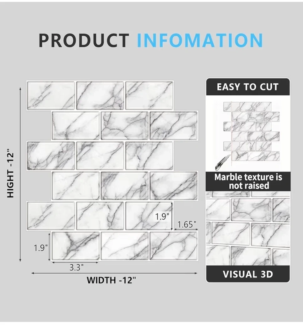 🥕These are peel and stick vinyl wall tiles. They come in a pack of 10 sheets. Each tile measures 12x12 inches (30.5cm x 30.5cm). They're waterproof, moistureproof, anti-fouling, and easy to install.