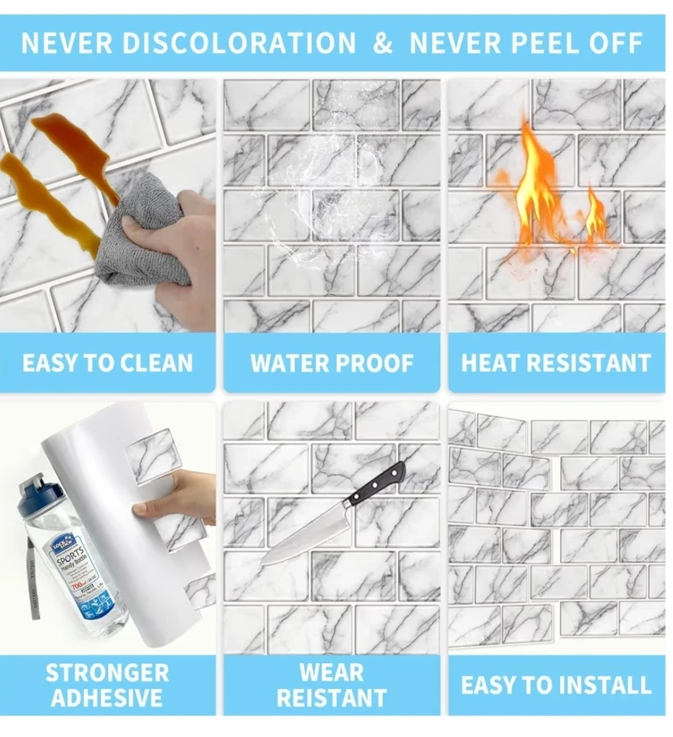 🥕These are peel and stick vinyl wall tiles. They come in a pack of 10 sheets. Each tile measures 12x12 inches (30.5cm x 30.5cm). They're waterproof, moistureproof, anti-fouling, and easy to install.
