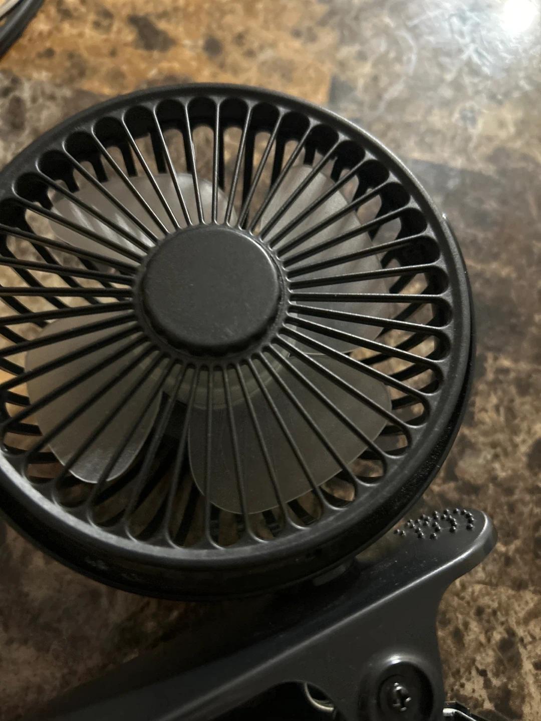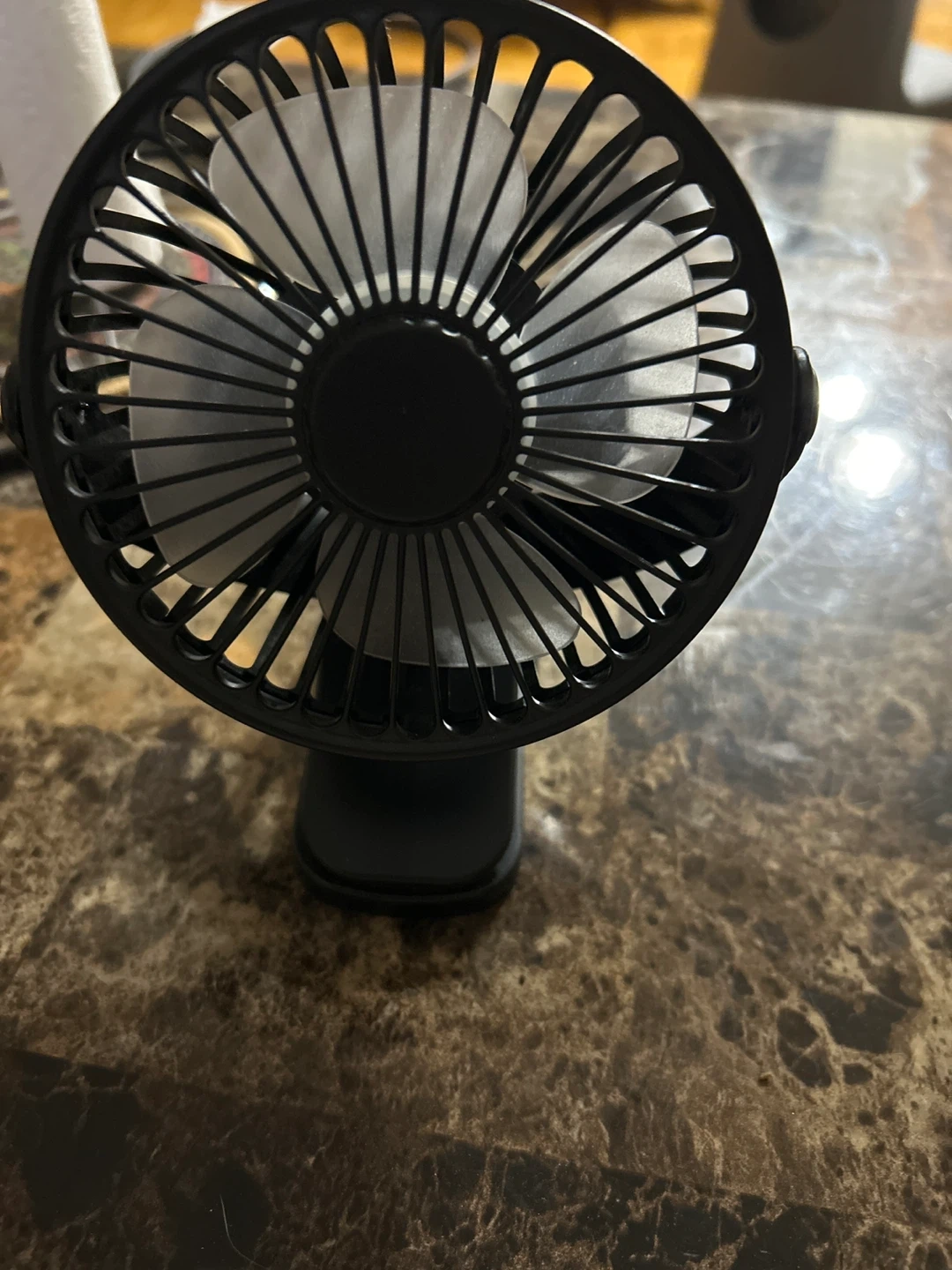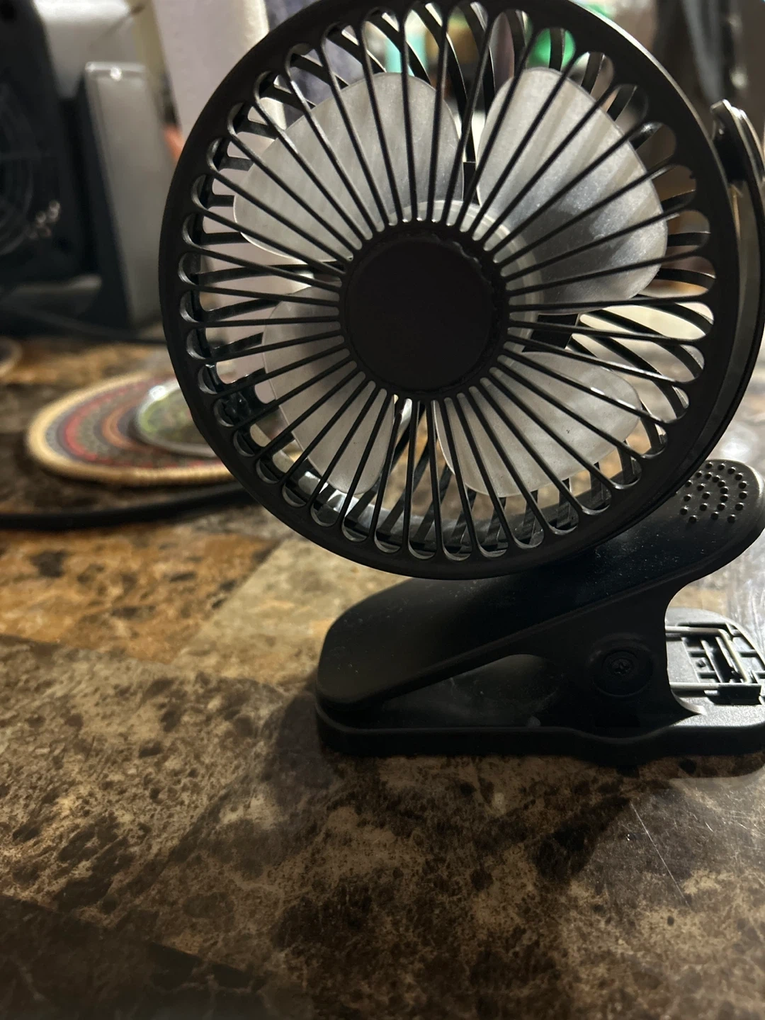 This is a New black clip-on mini USB desk fan. It's powered by USB and has a flexible gooseneck. The clip is strong and attaches to surfaces easily.