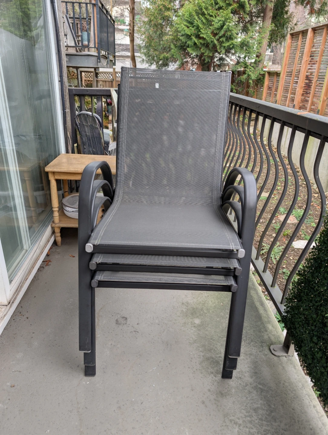 Buy & SellStackable Outdoor Chairs (Set of 3)Stackable Outdoor Chairs (Set of 3)$40Dark grey stackable outdoor chairs. These chairs have a metal frame with a mesh fabric seat and back. They're great for a balcony or patio!ConditionLike newWHERE TO MEETBus stationView MapSELLERverifiedAndresGrandview Woodland953 reviews0 chats·0 favorites·24 viewsSEND CHAT TO SELLERHi Andres! I’m interested in your listing.Hi Andres! I’m interested in your listing.Get the Karrot app to chatSign In to chat