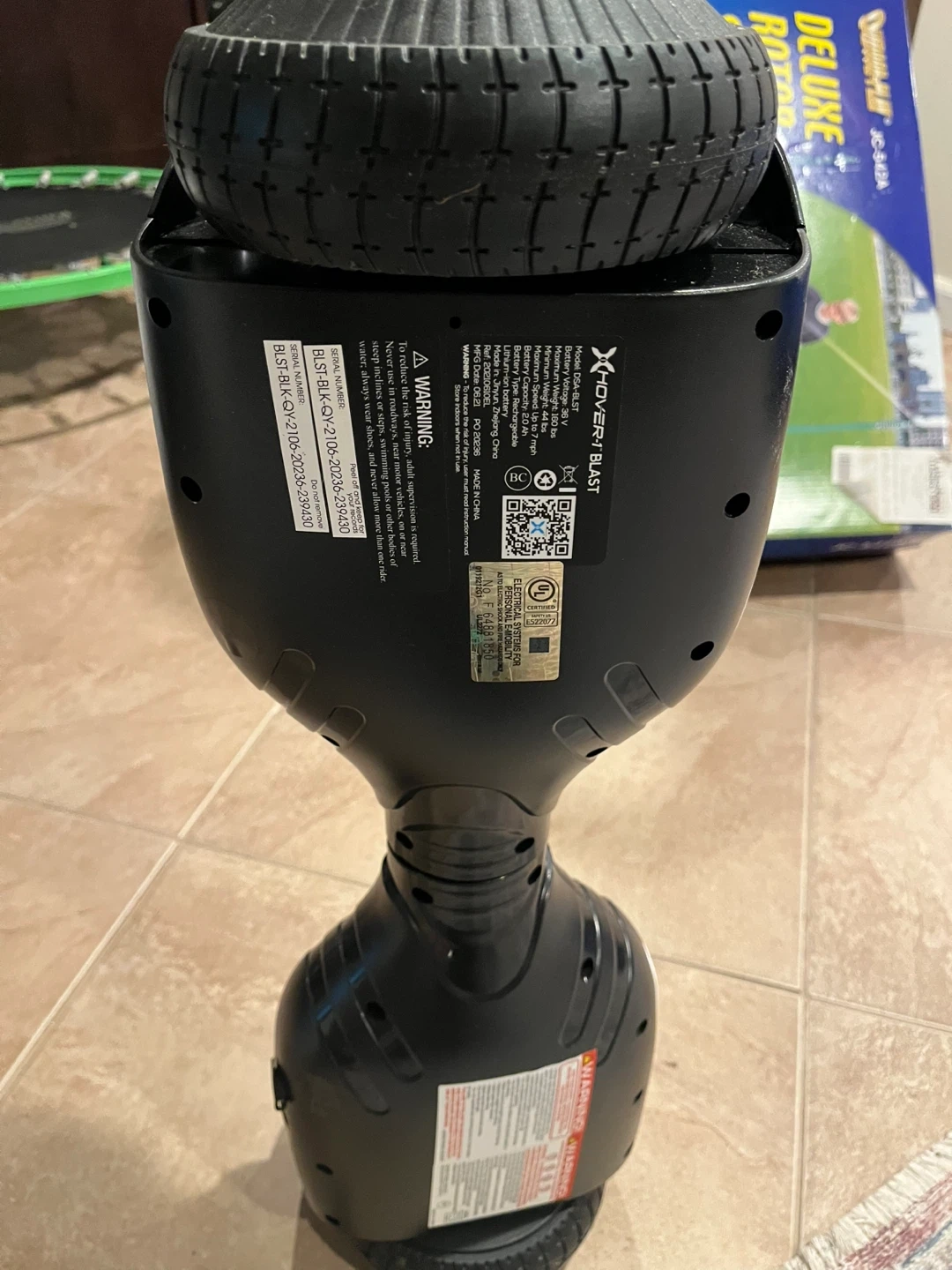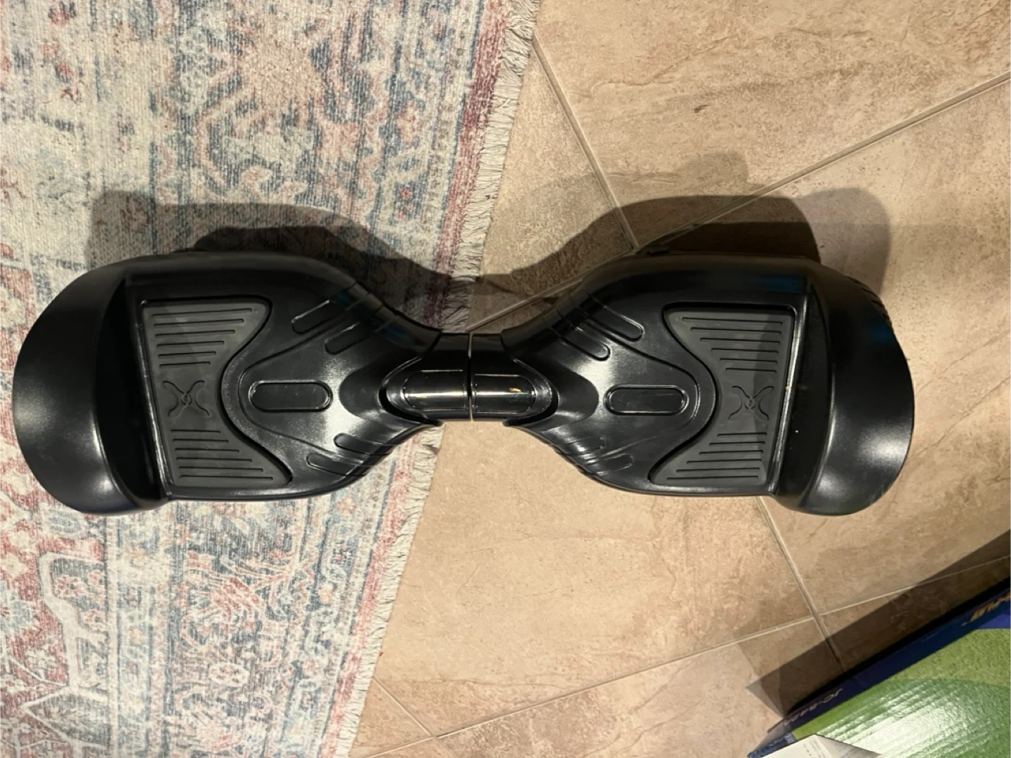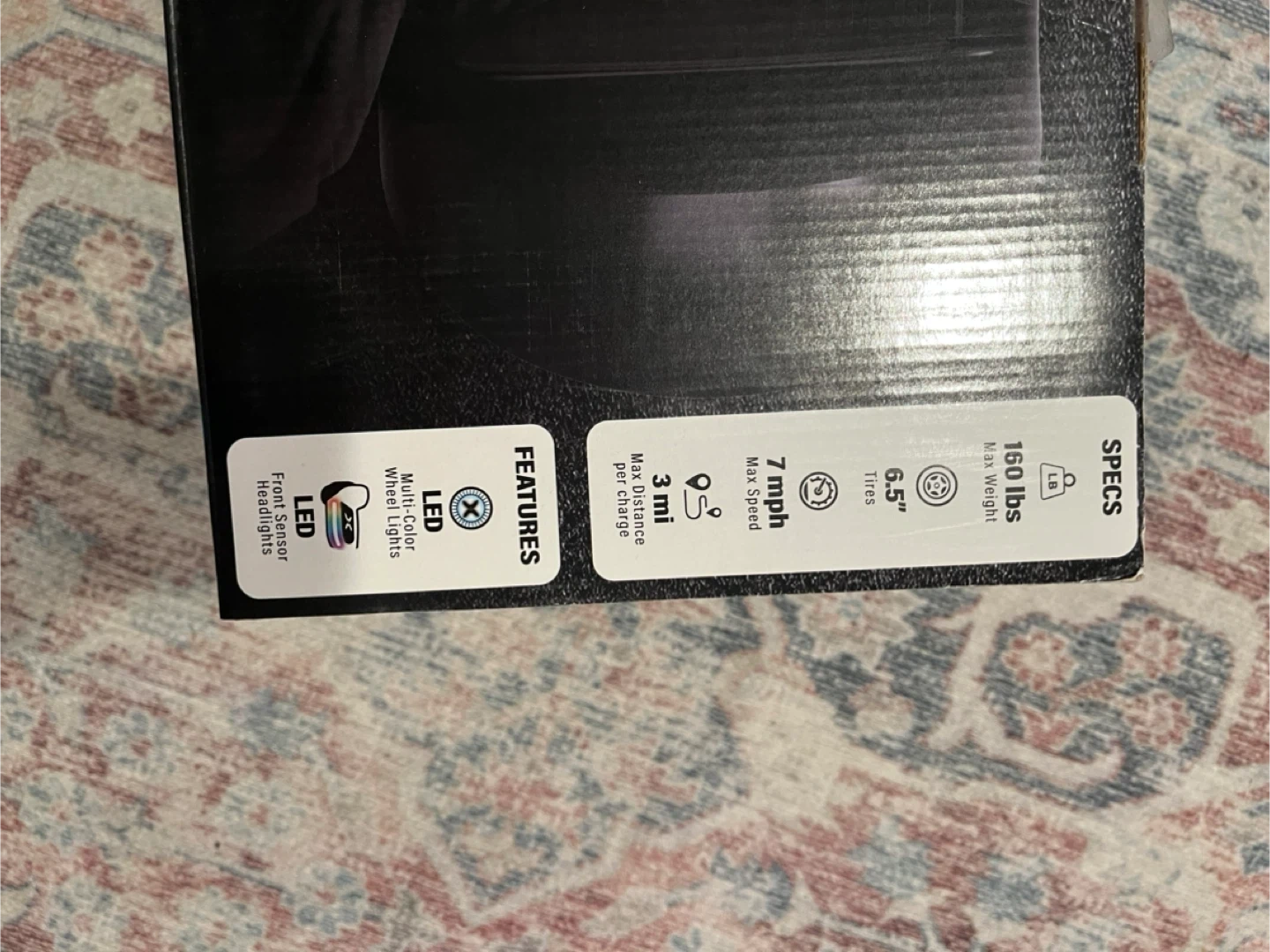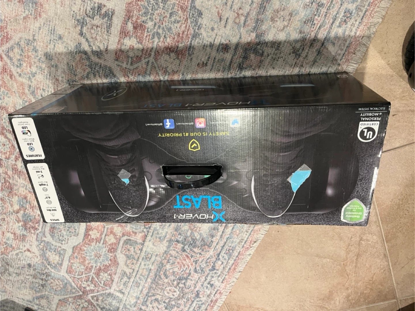 This Hover-1 Blast is a personal electric hoverboard. It has LED front sensor headlights and multi-color wheel lights. Max speed is 7 mph, with a max distance of 3 miles per charge. The max weight is 160 lbs. this item is brand new, has been we been used.