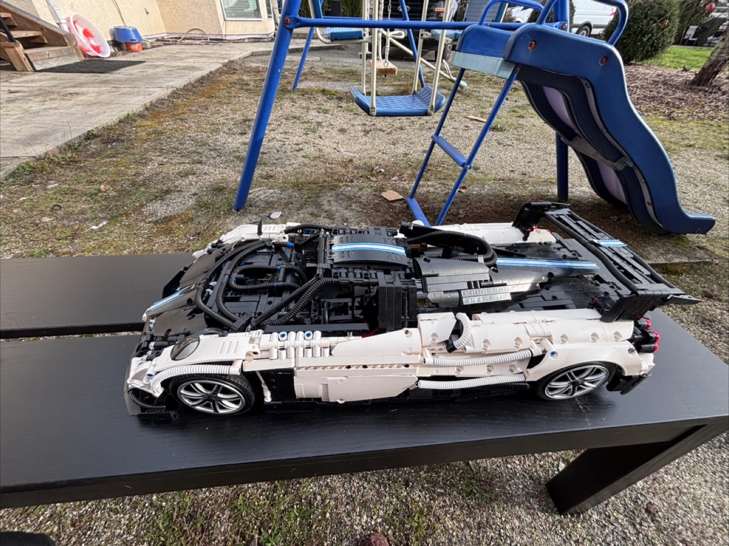 This is a detailed LEGO Technic car model. It features intricate mechanical components and realistic design elements. It's built for display or play.