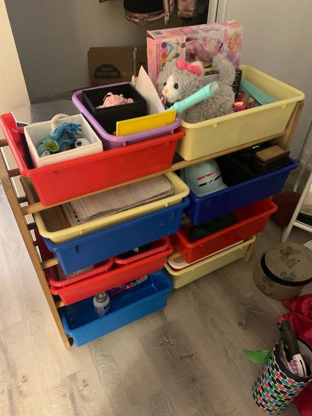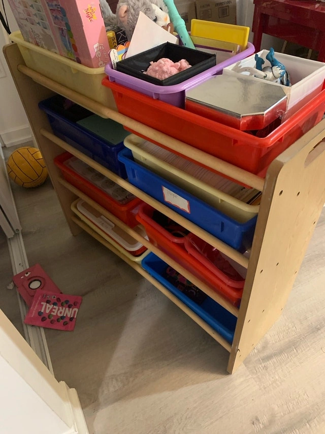This solid wood storage unit is perfect for a kids room or playroom! It features multiple colourful bins for organizing toys, books, and other items. It's in used condition and has some wear and tear, but is still very functional. If the ad's still up, it's ready for a new home. Cash accepted.