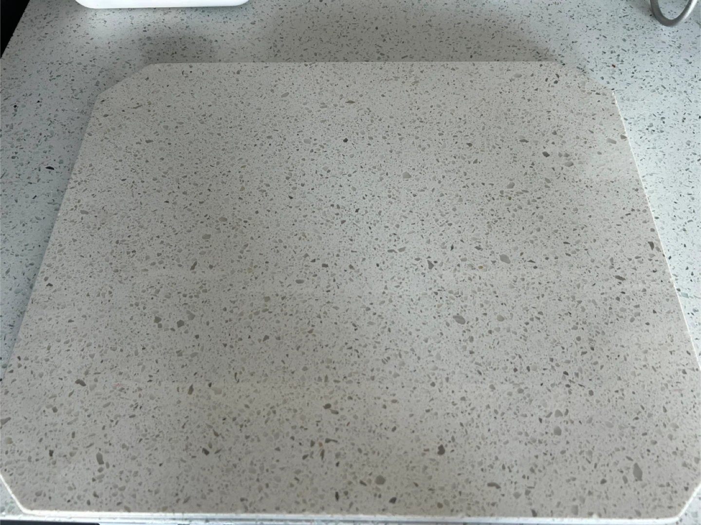 This is a sturdy cutting board with a speckled white and grey design. It's made from a durable material, likely composite or quartz-like. Its angled corner is a unique design touch. It's great for everyday food prep!