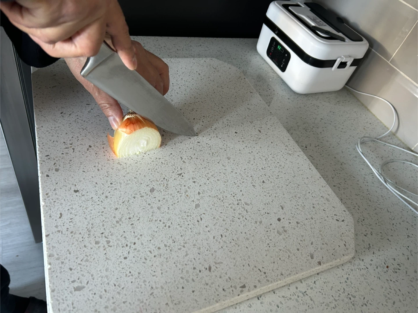 This is a sturdy cutting board with a speckled white and grey design. It's made from a durable material, likely composite or quartz-like. Its angled corner is a unique design touch. It's great for everyday food prep!