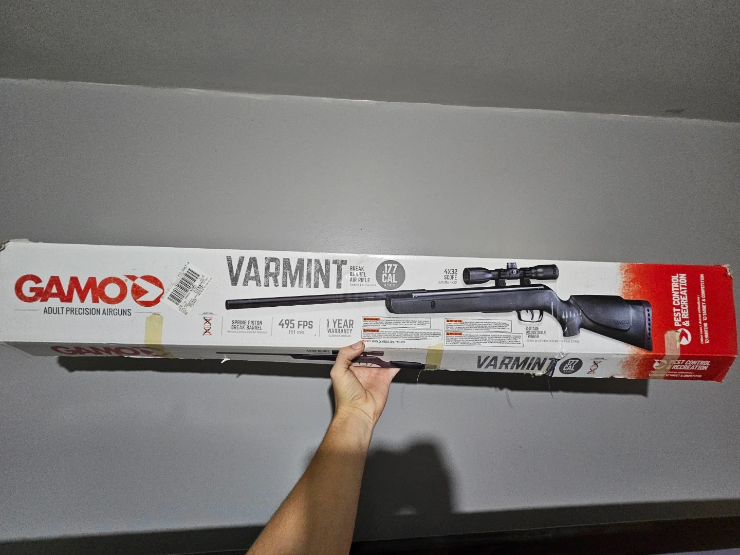 This Gamo Varmint air rifle shoots at 495 FPS and comes with a 4x32 scope. Ive only shot it a couple times comes with everything it comes with brand new plus pellets