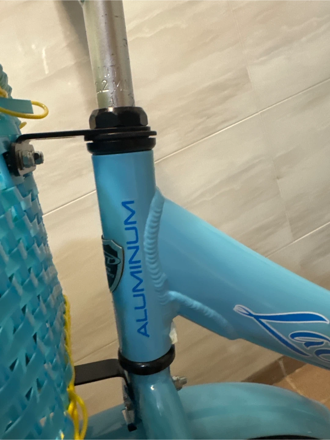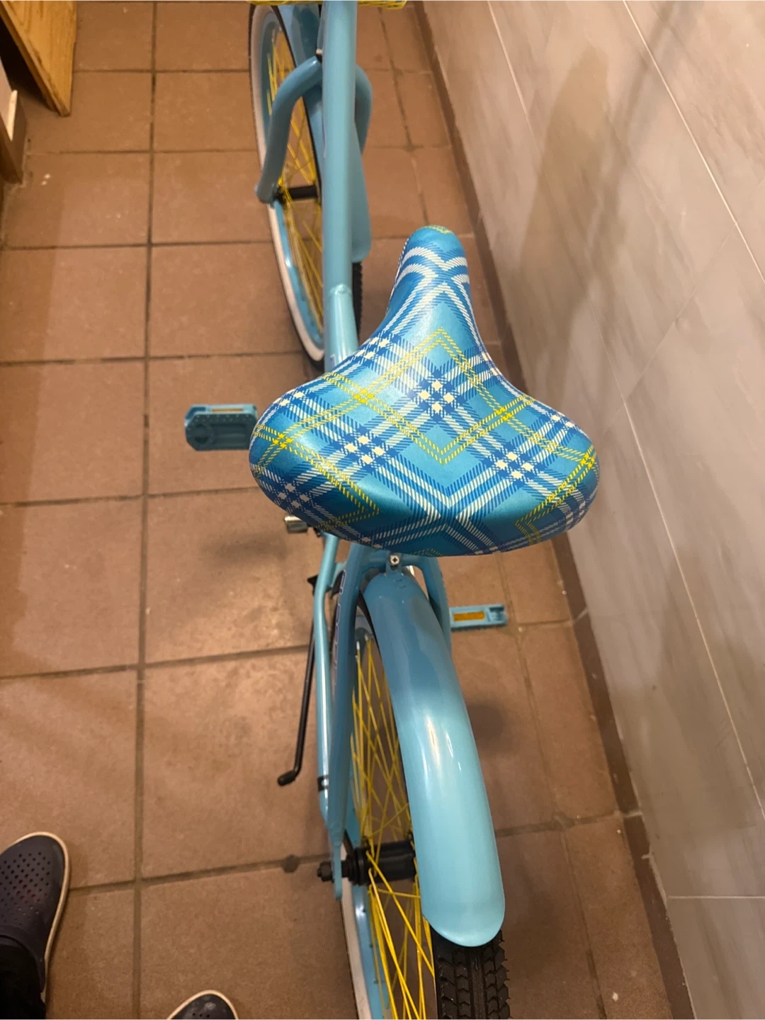 This is a light blue cruiser bicycle. It features a unique plaid seat and a matching blue basket. The frame is aluminum and it has yellow spokes. A helmet is included in the basket.