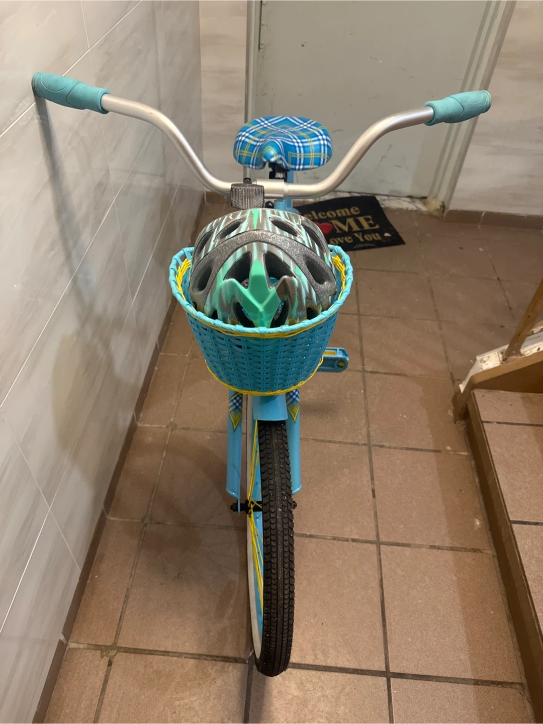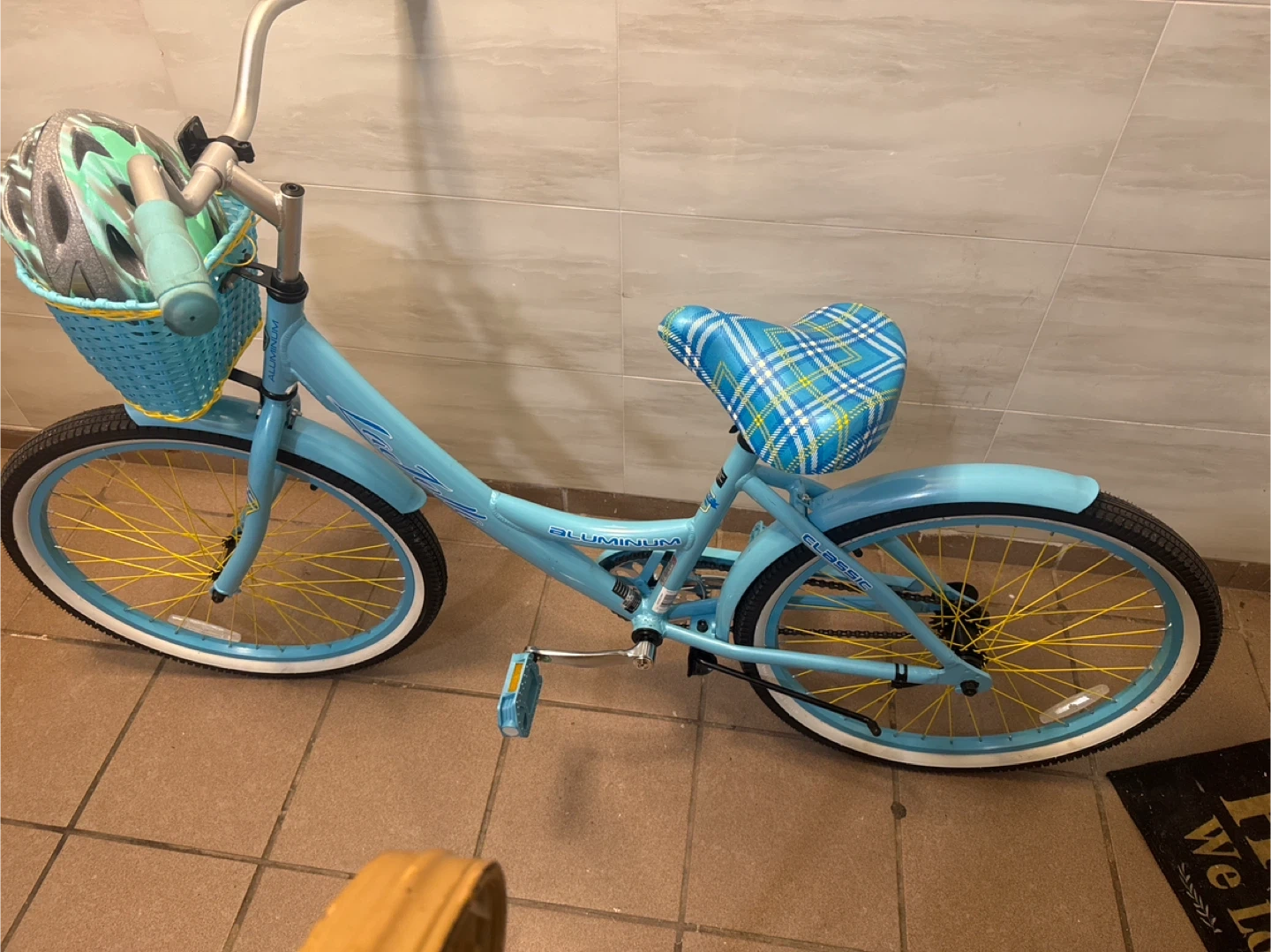 This is a light blue cruiser bicycle. It features a unique plaid seat and a matching blue basket. The frame is aluminum and it has yellow spokes. A helmet is included in the basket.