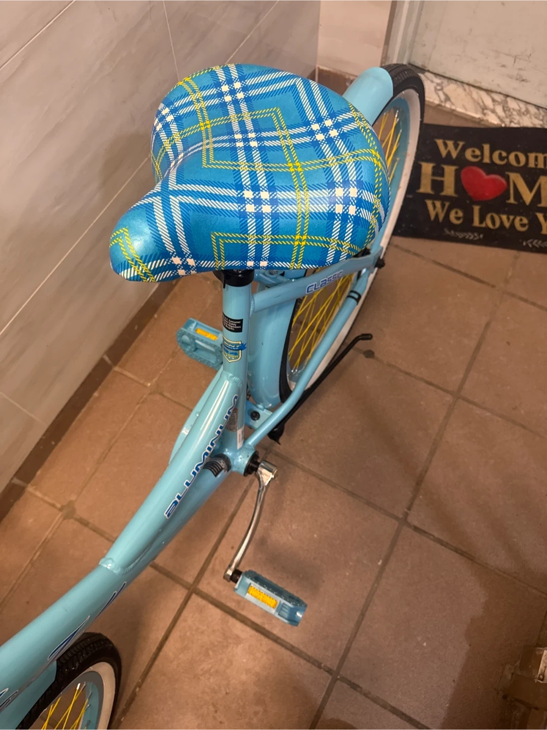 Blue Cruiser Bicycle with Plaid Seat and Basket