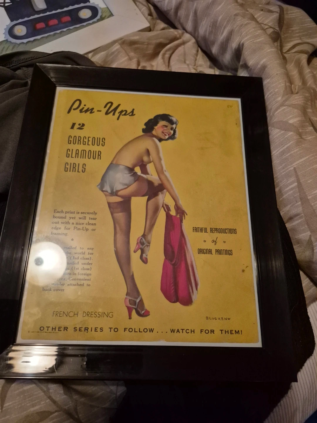 This is a framed print featuring 12 gorgeous glamour girls. Each print is designed to tear out cleanly for framing or pin-up display. It's a faithful reproduction of original paintings by Elvgren.