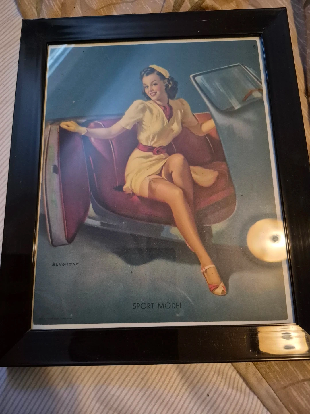 Vintage framed pin-up art print by Gil Elvgren titled "Sport Model". It features a classic pin-up illustration with a woman posing in a convertible. The print is housed in a black frame.