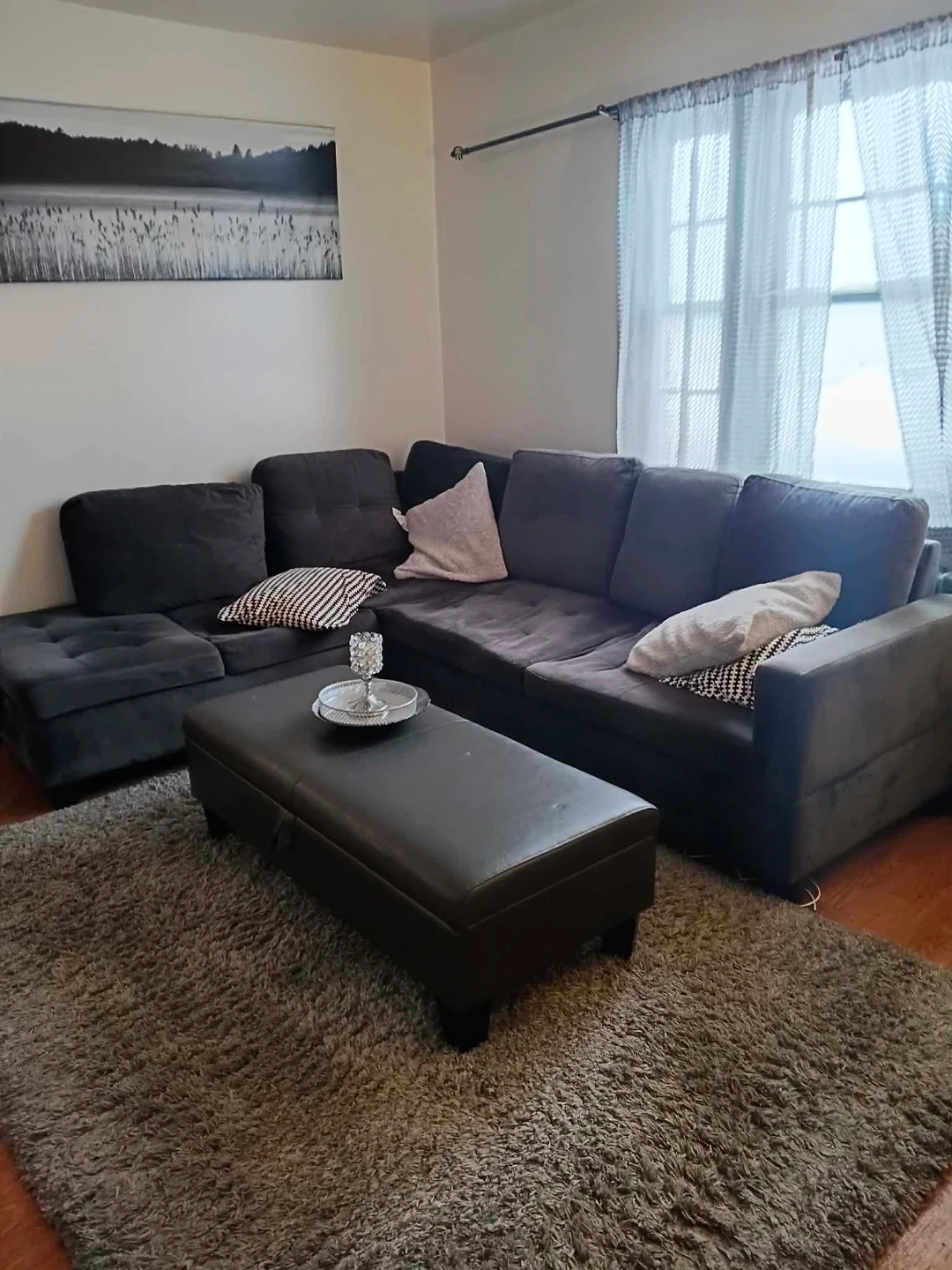 Comfortable dark grey fabric sectional sofa with tufted cushions. It comes with a matching dark brown storage ottoman. The sofa's fabric is soft and durable. It's a great addition to any living room for ample seating.