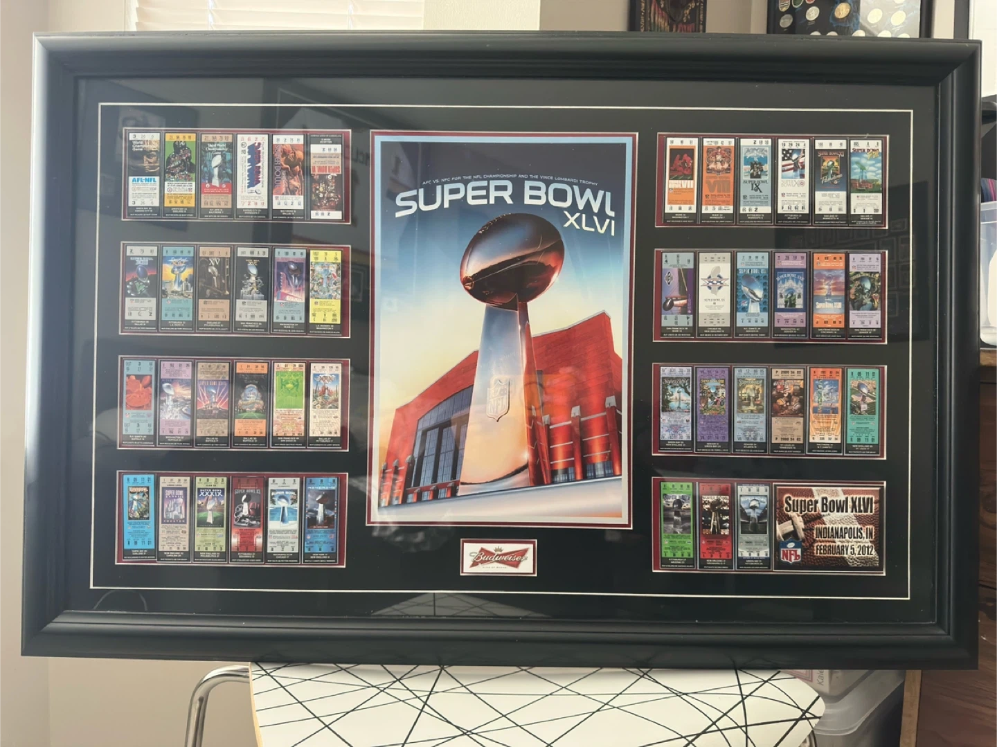 This framed display showcases a collection of ticket stubs from various Super Bowls, including Super Bowl XLVI held in Indianapolis. It features a central Super Bowl XLVI graphic and Budweiser branding. A great piece for any football enthusiast!