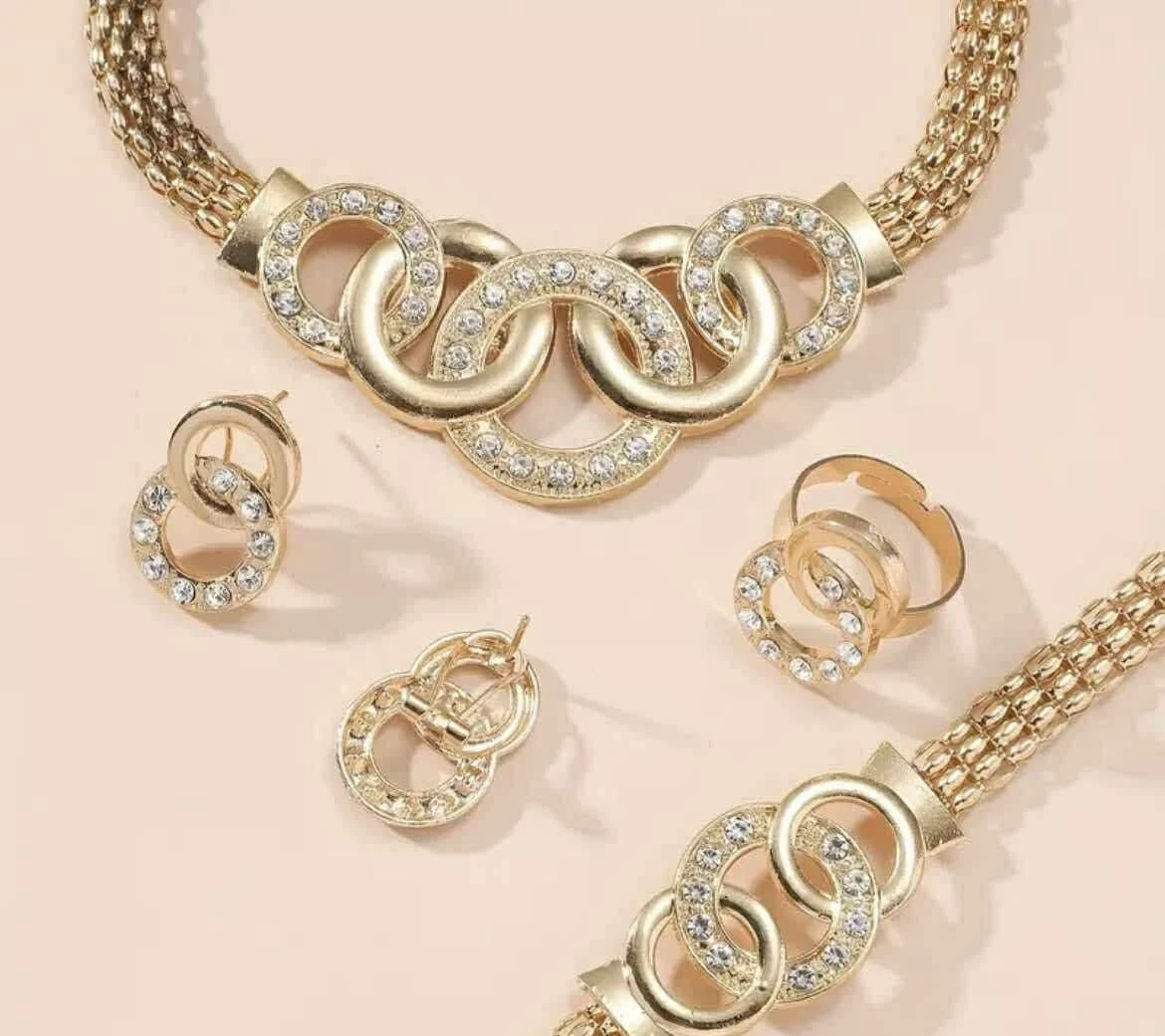 This dazzling gold-tone jewelry set includes a necklace, earrings, ring, and bracelet. Each piece features interlocking circles accented with sparkling rhinestones. It's a great way to add some shine to your outfit!