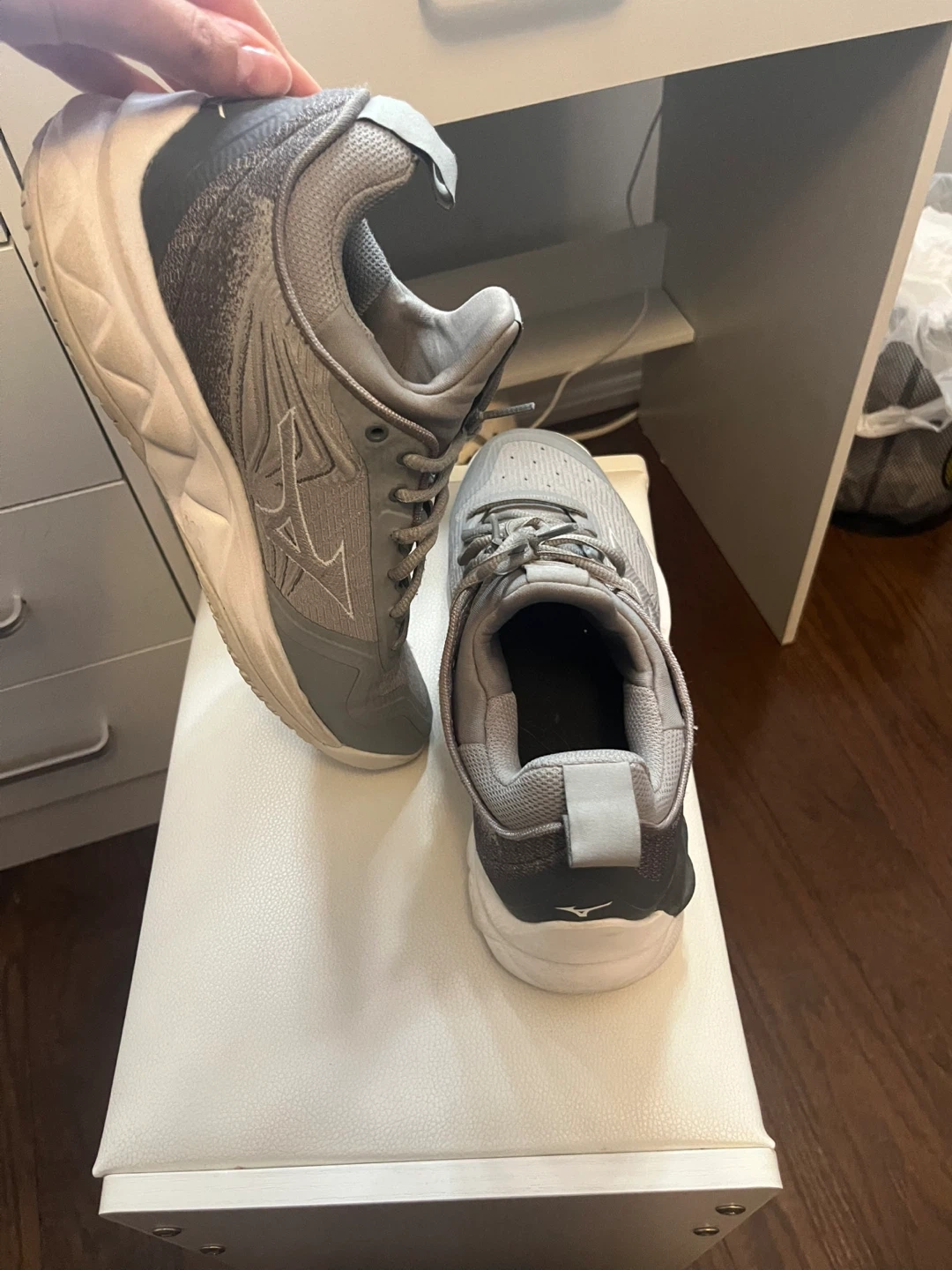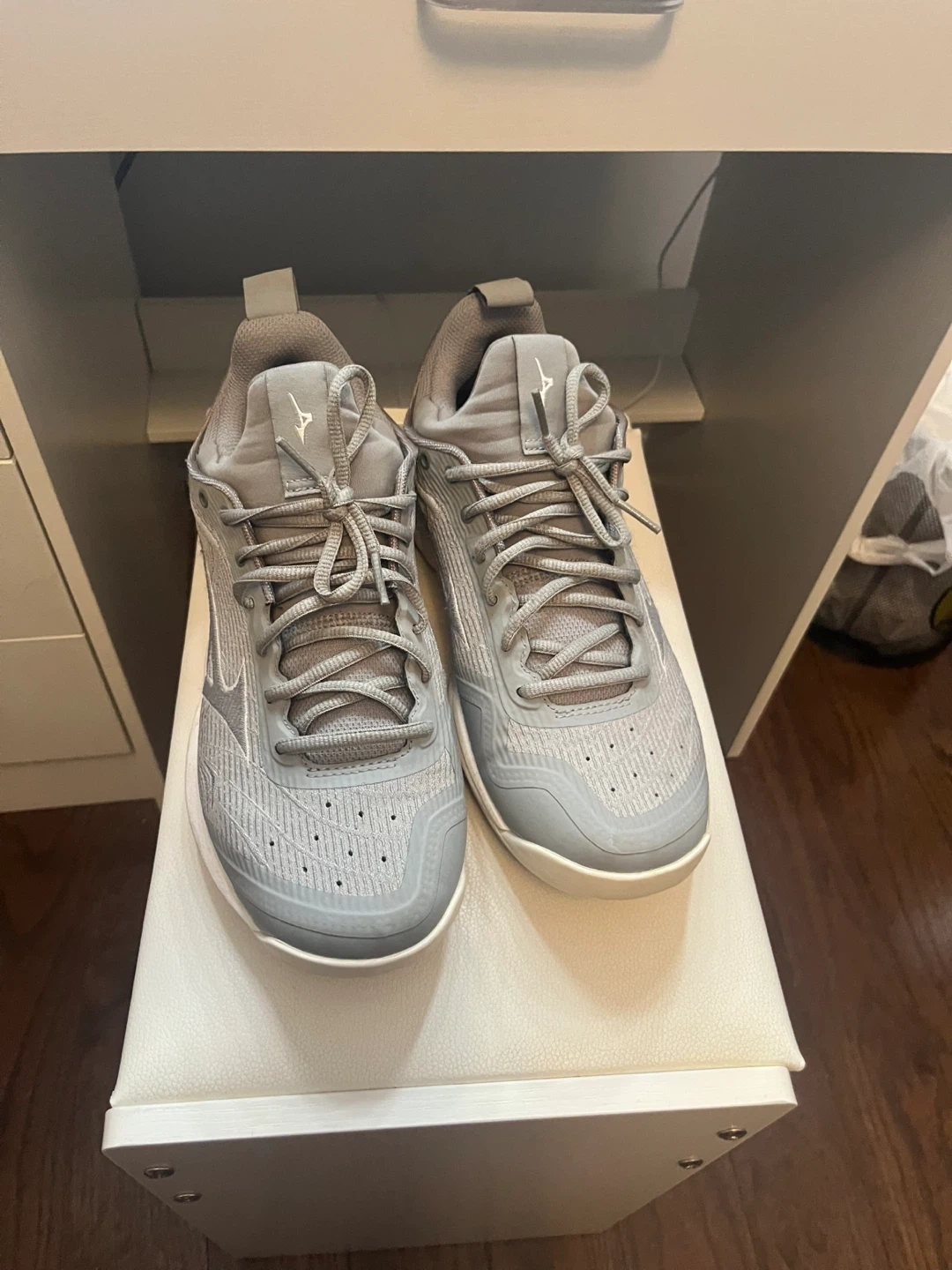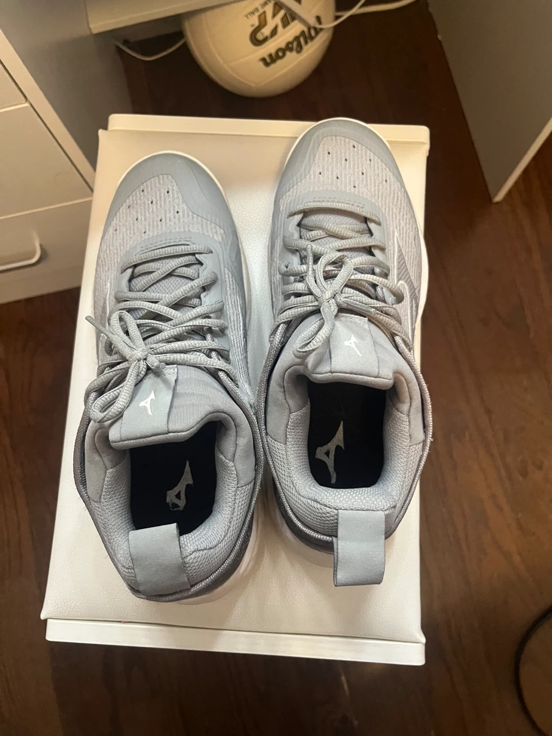 These are Mizuno volleyball shoes in a grey colour. They're designed for athletic performance on the court. The material appears to be a lightweight mesh and synthetic blend.