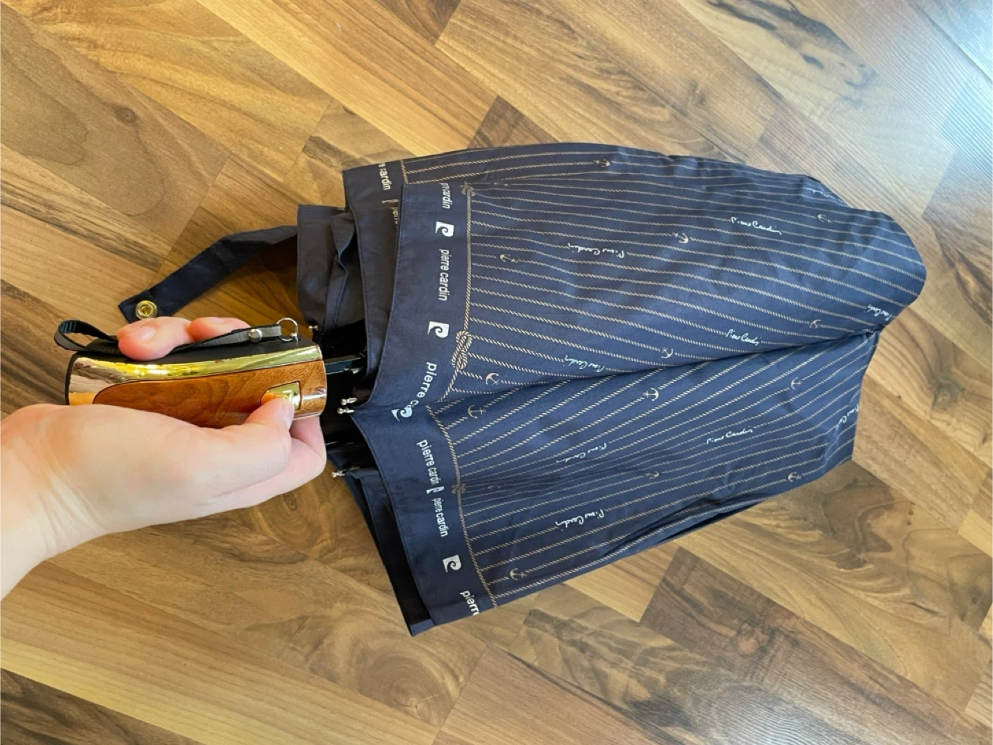This is a navy blue umbrella from Pierre Cardin. It features a pinstripe pattern with small anchor and signature logos. Includes a matching sleeve for storage.