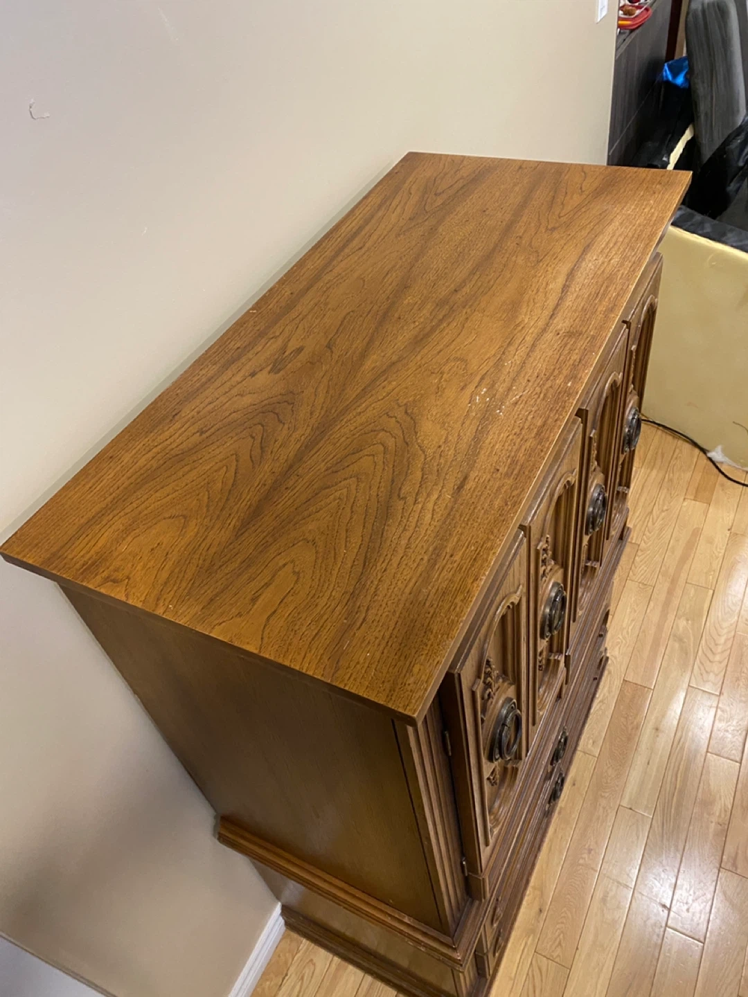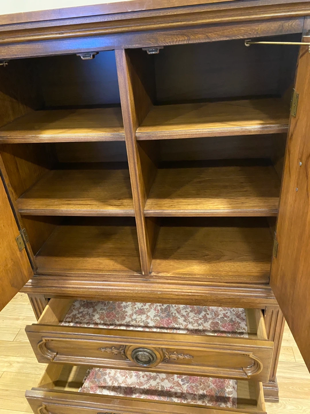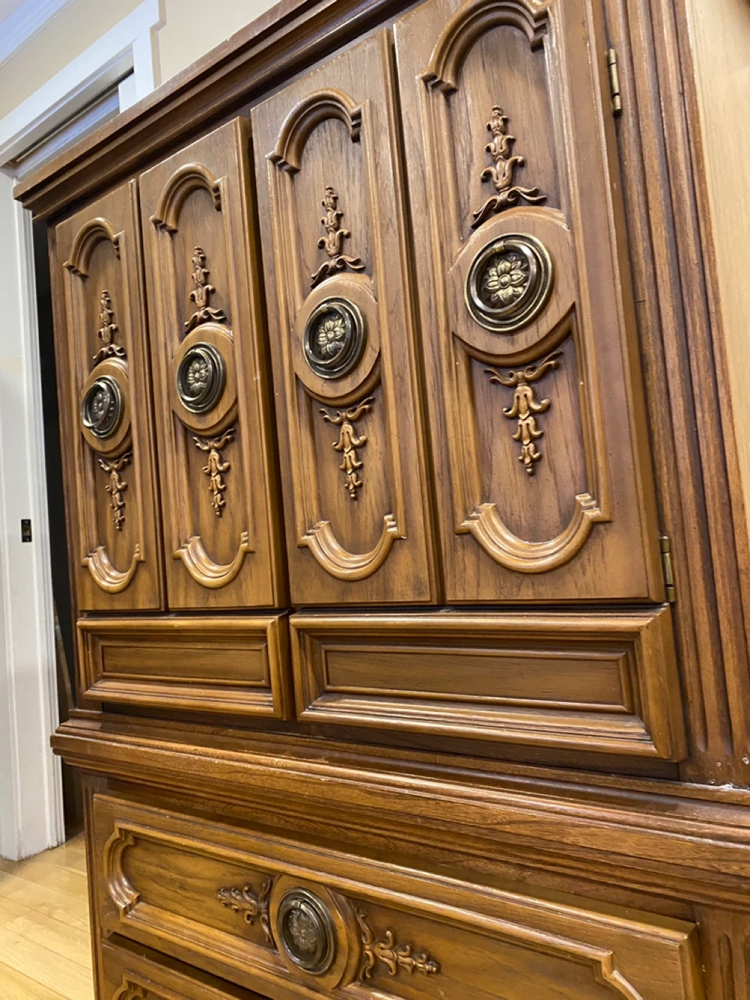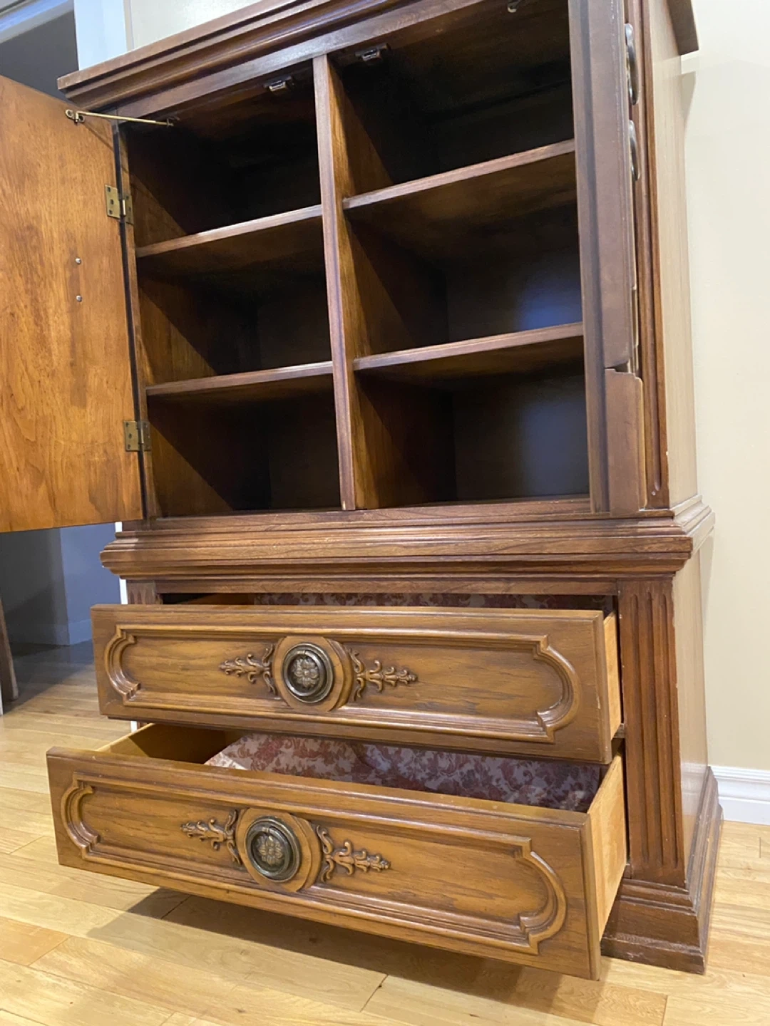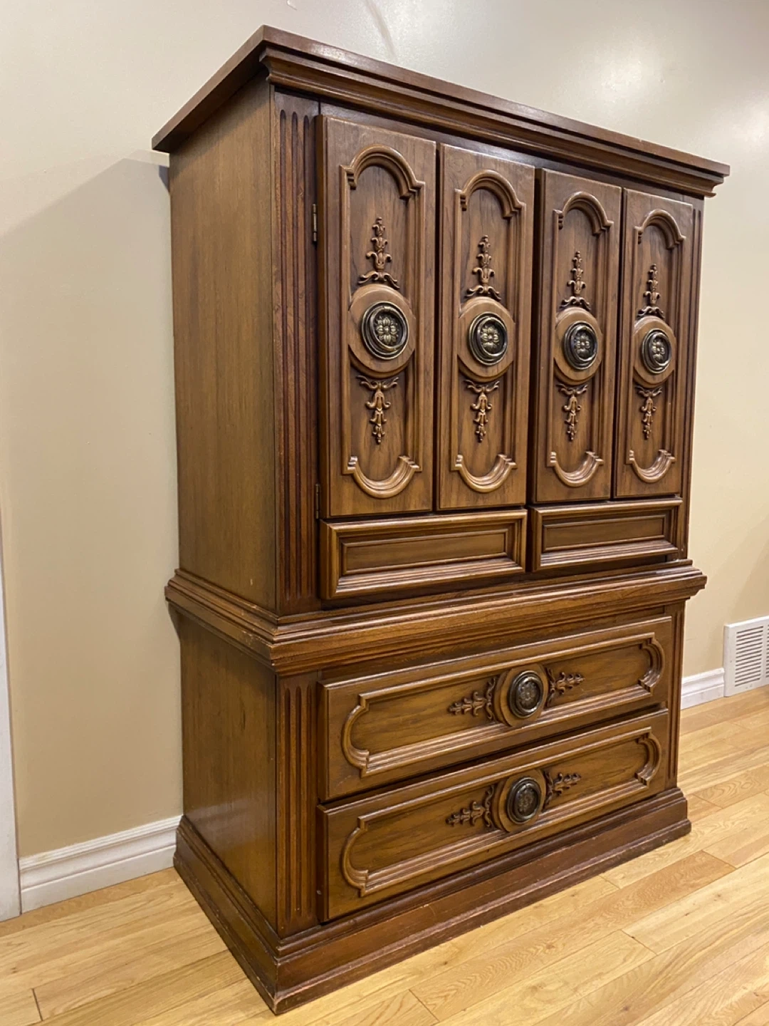 Beautiful vintage solid wood armoire with classic carved detailing and original hardware. Features upper cabinet doors with shelving and two spacious lower drawers—perfect for clothing, linens, or general storage.