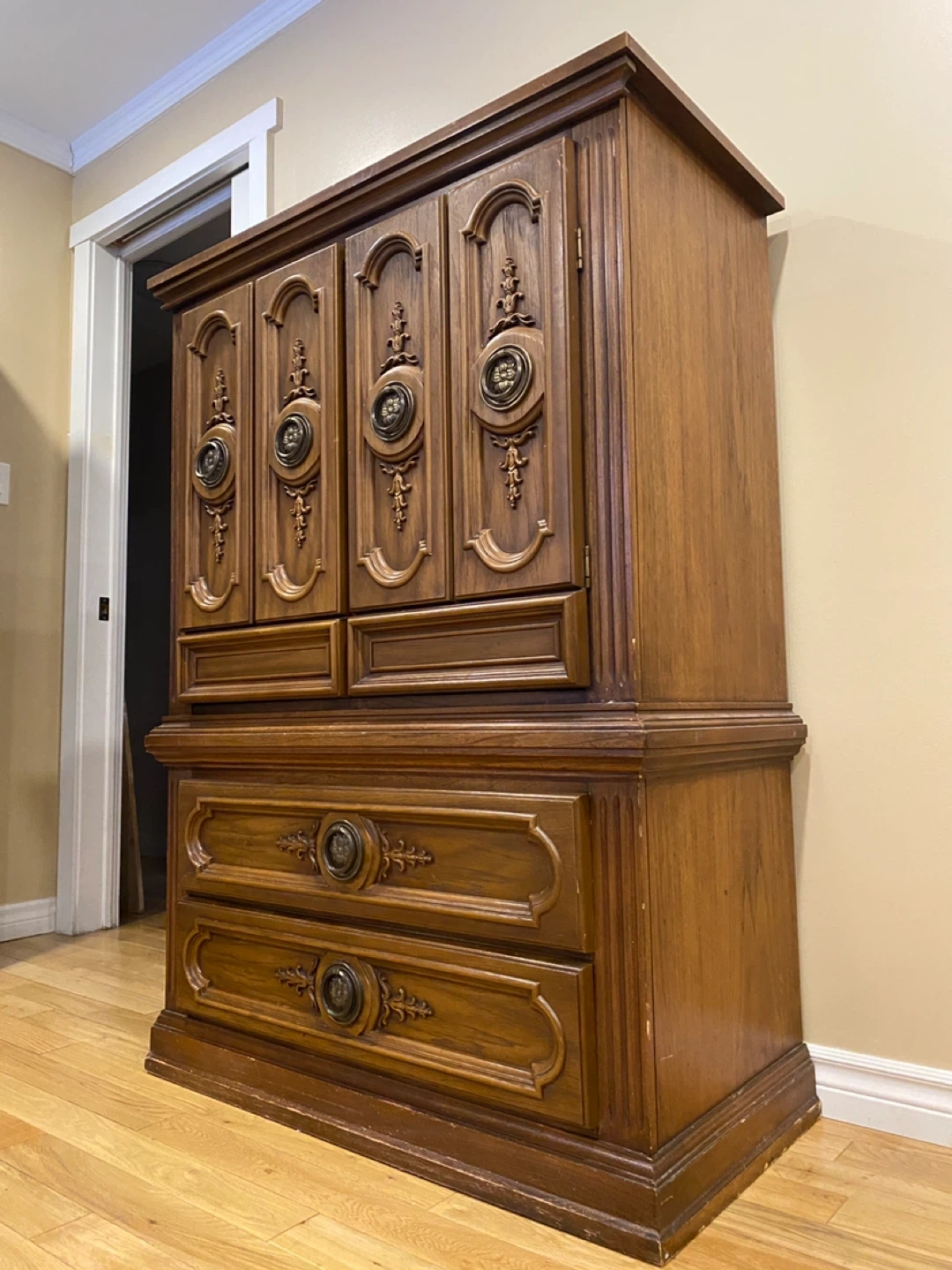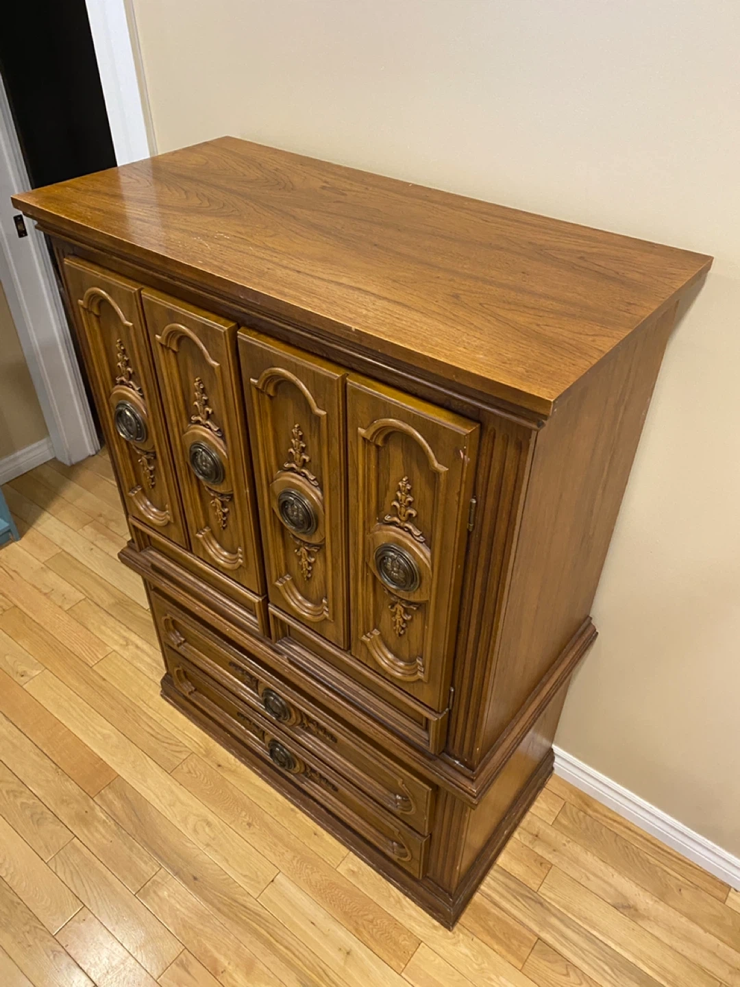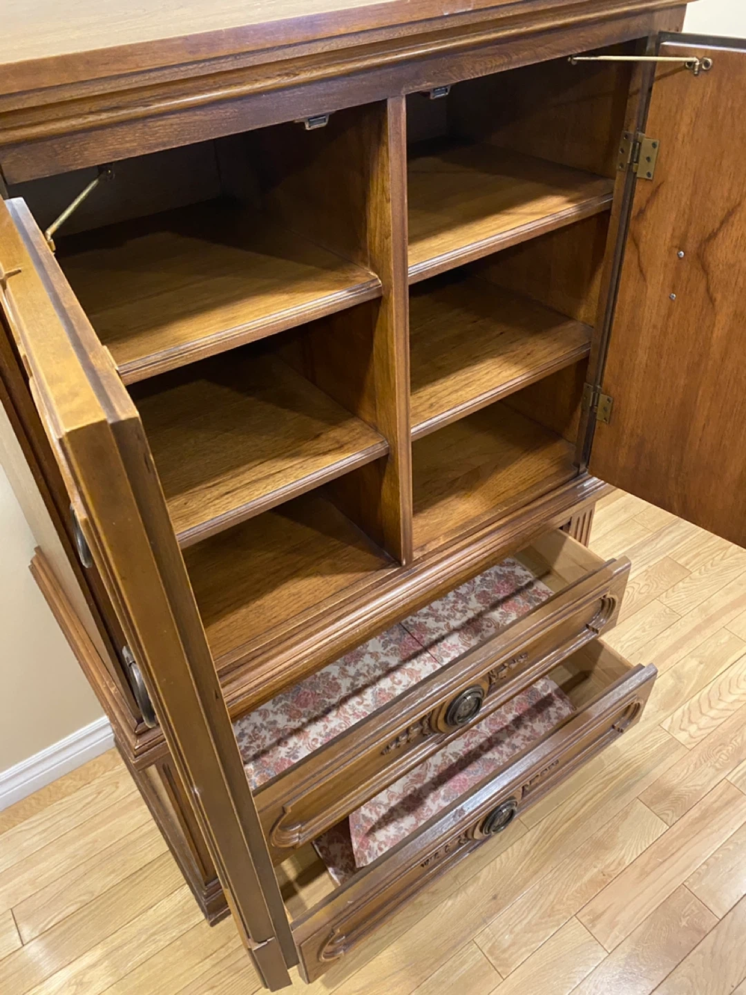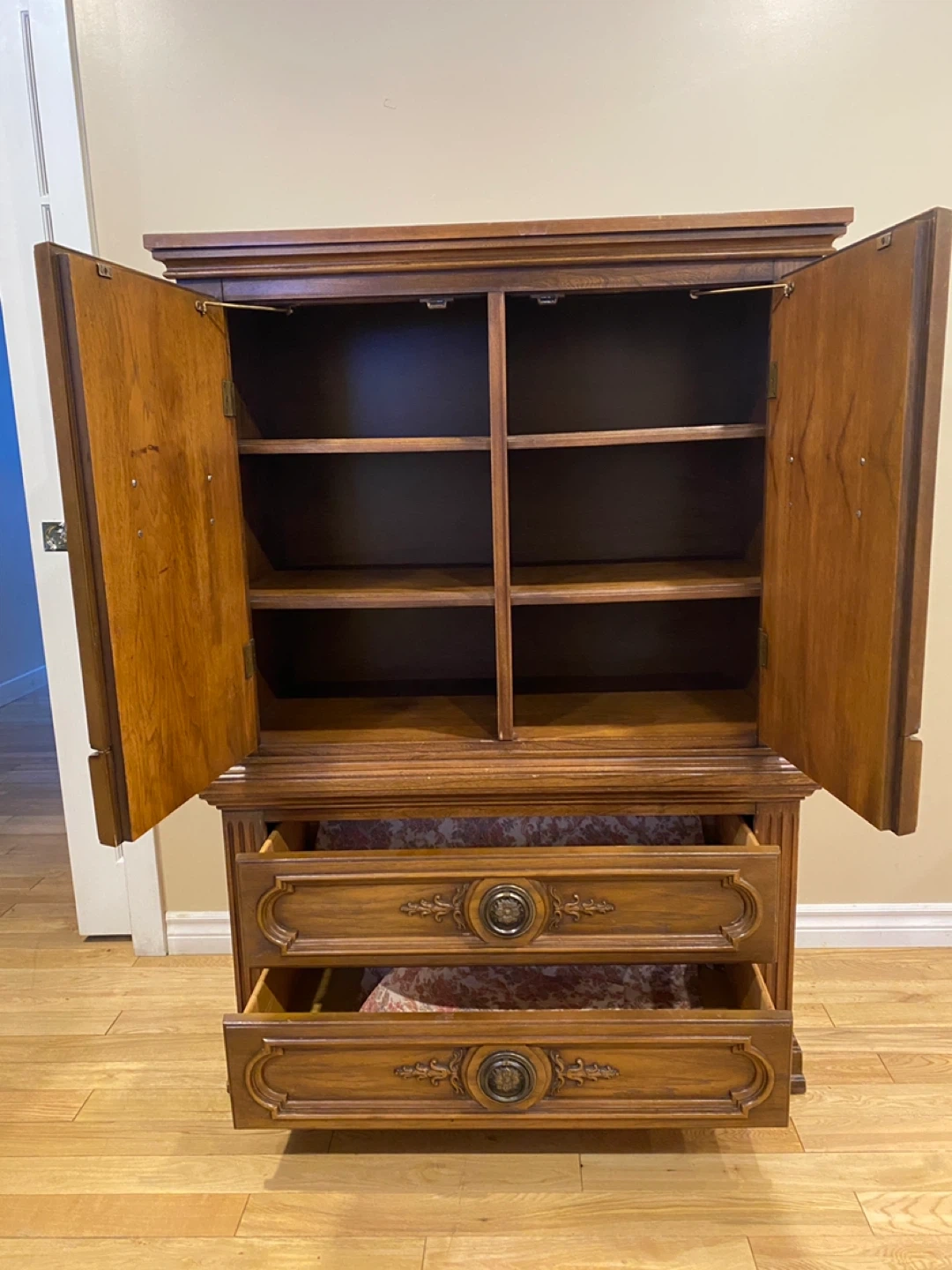 Beautiful vintage solid wood armoire with classic carved detailing and original hardware. Features upper cabinet doors with shelving and two spacious lower drawers—perfect for clothing, linens, or general storage.