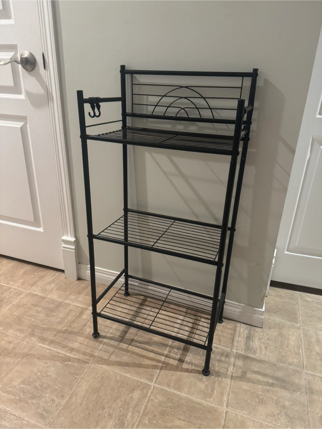 A black metal 3-tier shelf unit. It includes two hanging hooks on the side. This unit is great for organizing items in a small space.